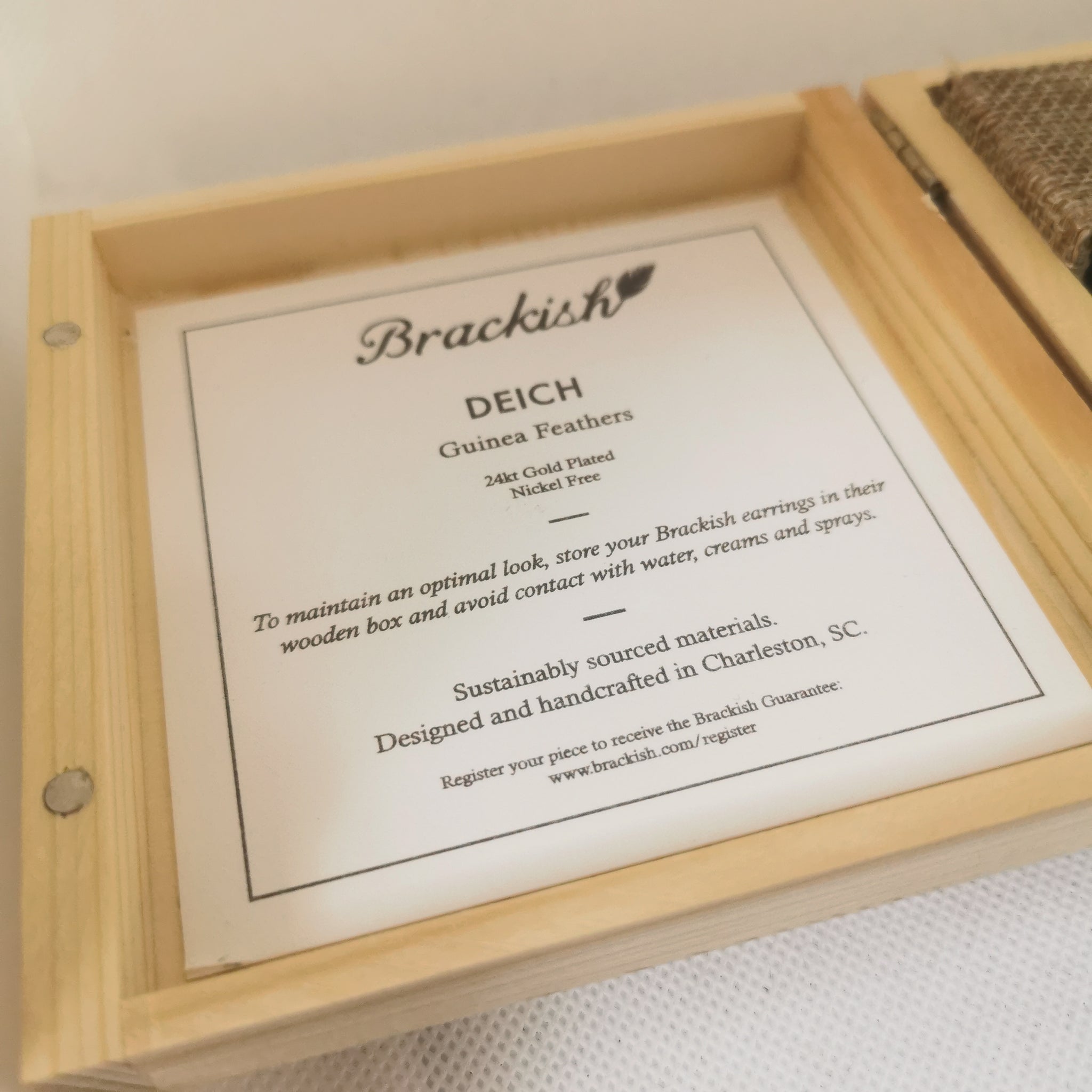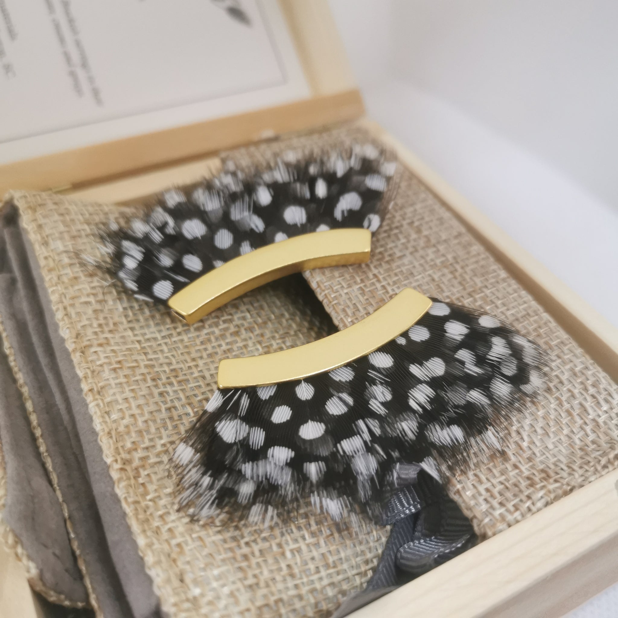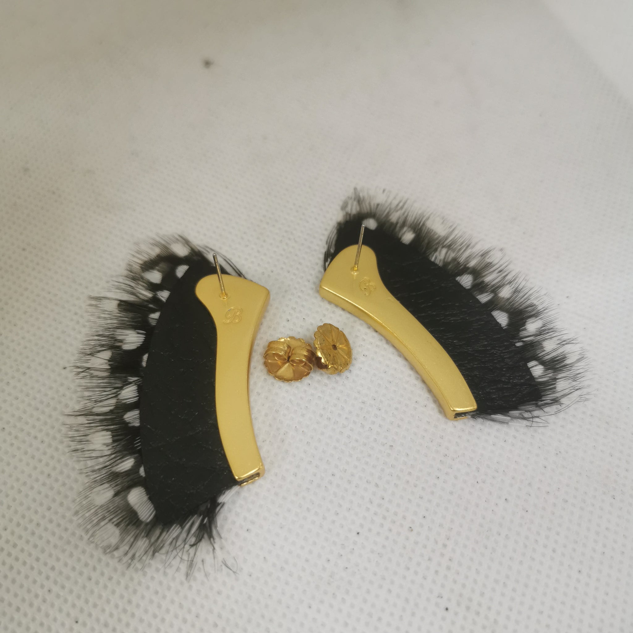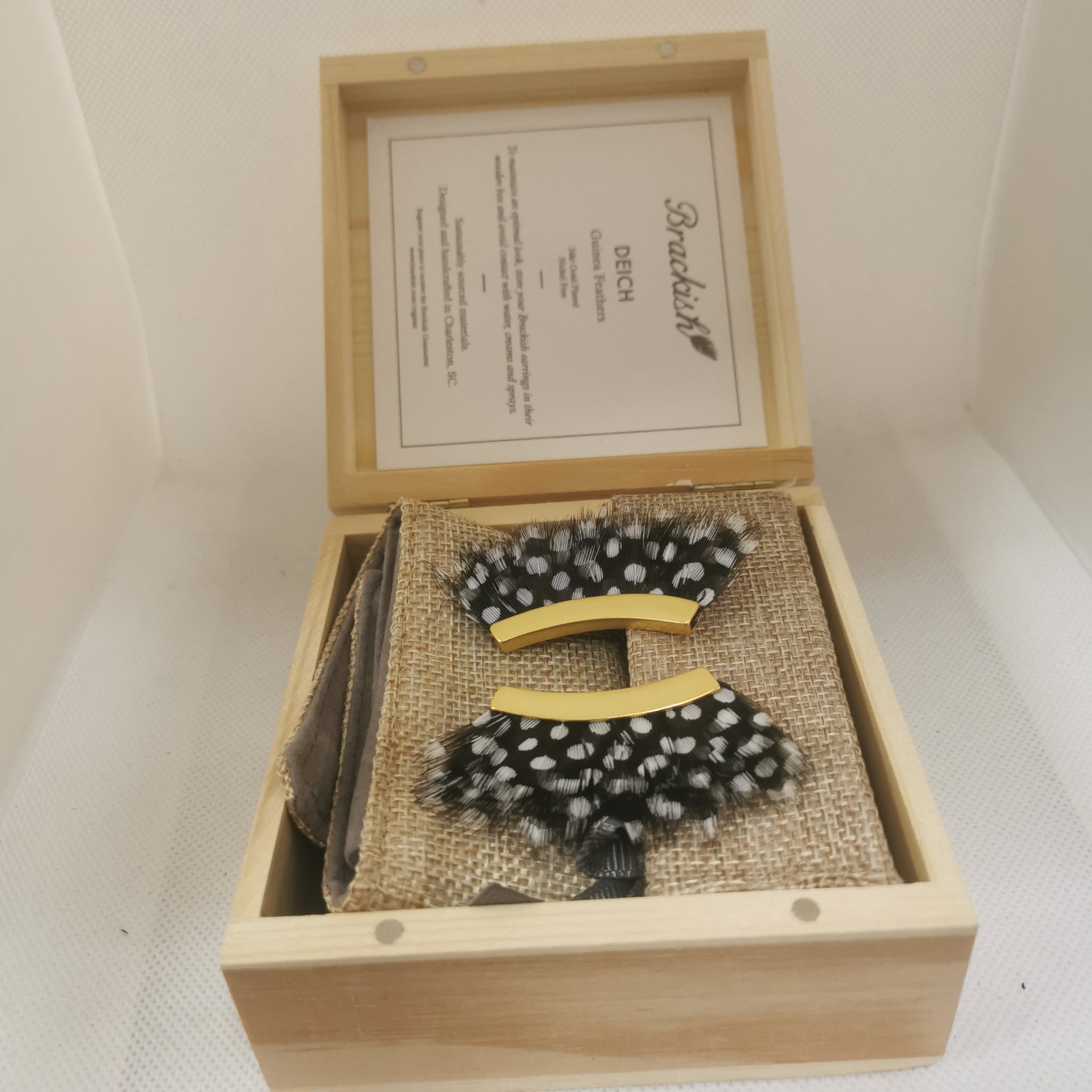 Brackish Deich Guinea Feathers 24K Gold Plated Earrings, Original Box and Bag