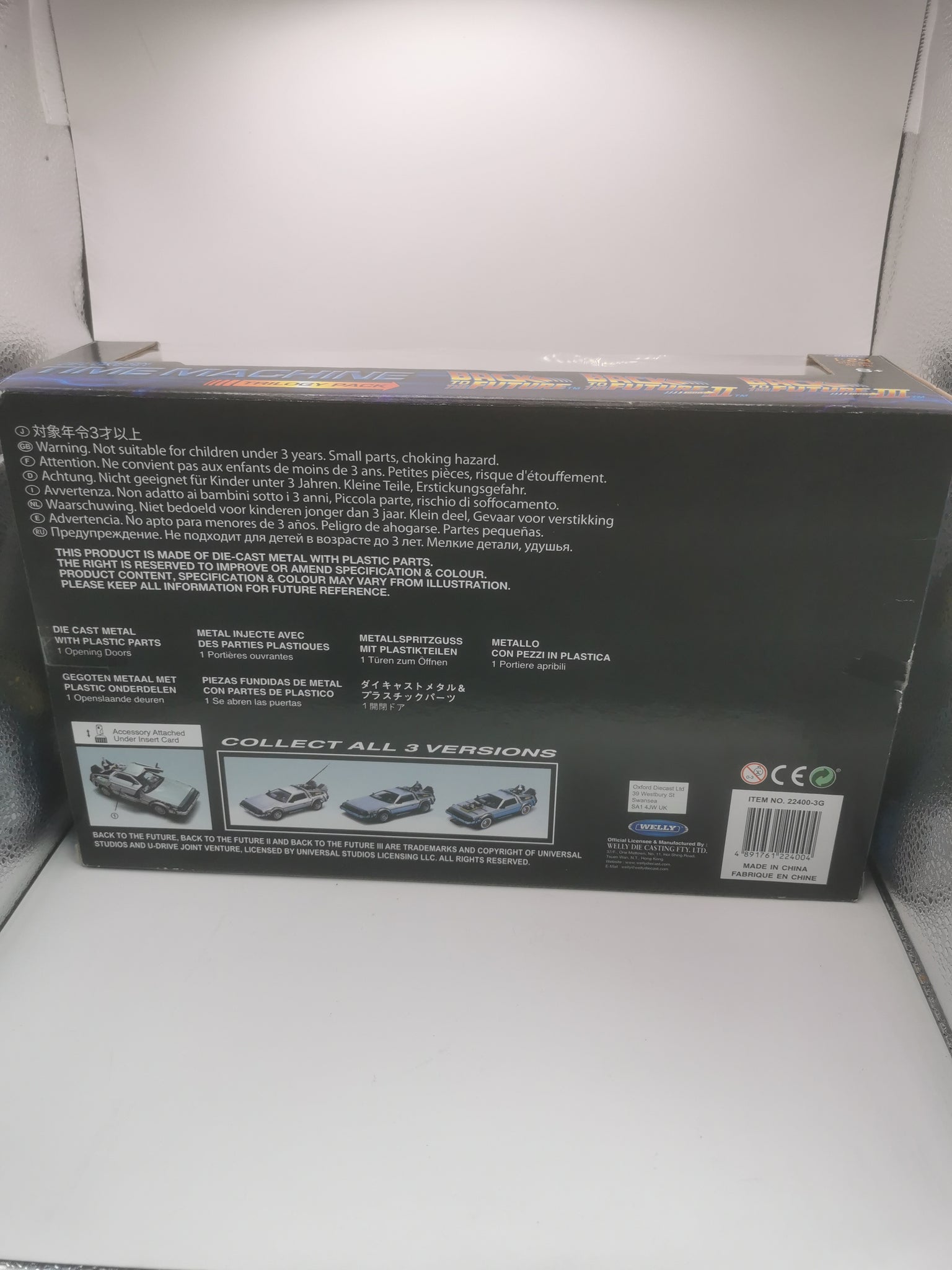 The Welly 22400-3G is a 1/24 scale diecast model set featuring three DeLorean Time Machines from the Back to the Future trilogy (Parts I, II, & III), offering excellent value with opening doors, detailed interiors, free-rolling wheels, and realistic badging, capturing the iconic time-traveling vehicle with movie-accurate features like the flux capacitor (in some versions) and lightning rod, ideal for fans and collectors. Key Features: Trilogy Set: Includes three distinct DeLorean models representing the first, second, and third films. Scale: 1:24 scale, approximately 7-8 inches (18-20 cm) long. Material: Diecast metal body with plastic detail parts. Details: Accurate body profiles, realistic DMC logos, detailed interiors, and free-rolling wheels. Functionality: Opening doors reveal interior details, and some versions include movie-specific accessories like the lightning rod. Value: Known for providing good detail and quality at an affordable price point for collectors. Movie-Specific Details (Varies by Version): Back to the Future I: Often includes the lightning rod accessory. Back to the Future II: Features the "Mr. Fusion" energy reactor on the back. Back to the Future III: Includes the classic white-walled tires and railroad wheels for the 1885 setting.
