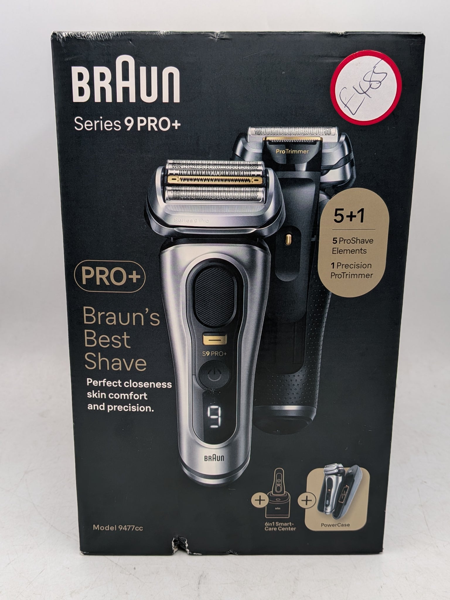 Series 9 Pro+ Braun's Best electric shaver with 5+1 perfectly synchronized shaving elements to gently cut the toughest beards in every stroke. 5+1 Synchronized shaving elements 1/5 Shaves up to 0.00 mm close & gentle 2 Protects the skin in every stroke 3 Captures hairs growing in different directions 4 Captures 1, 3 and 7-day beard + Long hair Precision ProTrimmer Ultra Thin Precision Blades Shave more efficiently than any previous Series 9 electric shaver, resulting in exceptional skin protection. Pro SensoAdapt Technology The high-precision sensors analyzes your beard density at 300x/sec and automatically adapts shaving power. Ultra adaptive 40° shaving head For maximum skin contact in hard-to-reach areas, like under chin and neck. Performance assistant display Guides you for the best shaver maintenance, with intuitive and easy to understand information, for a peak performance with every use. Made in Germany Tested to resist under water up to 24 hours. Wet or dry, with or without foam, this shaver is designed to last for years. 6in1 SmartCare Center Automatically selects the cleaning program, hygienically cleans, protects blades lifetime, optimizes performance, automatically dries and charges your shaver. All at the touch of a button.