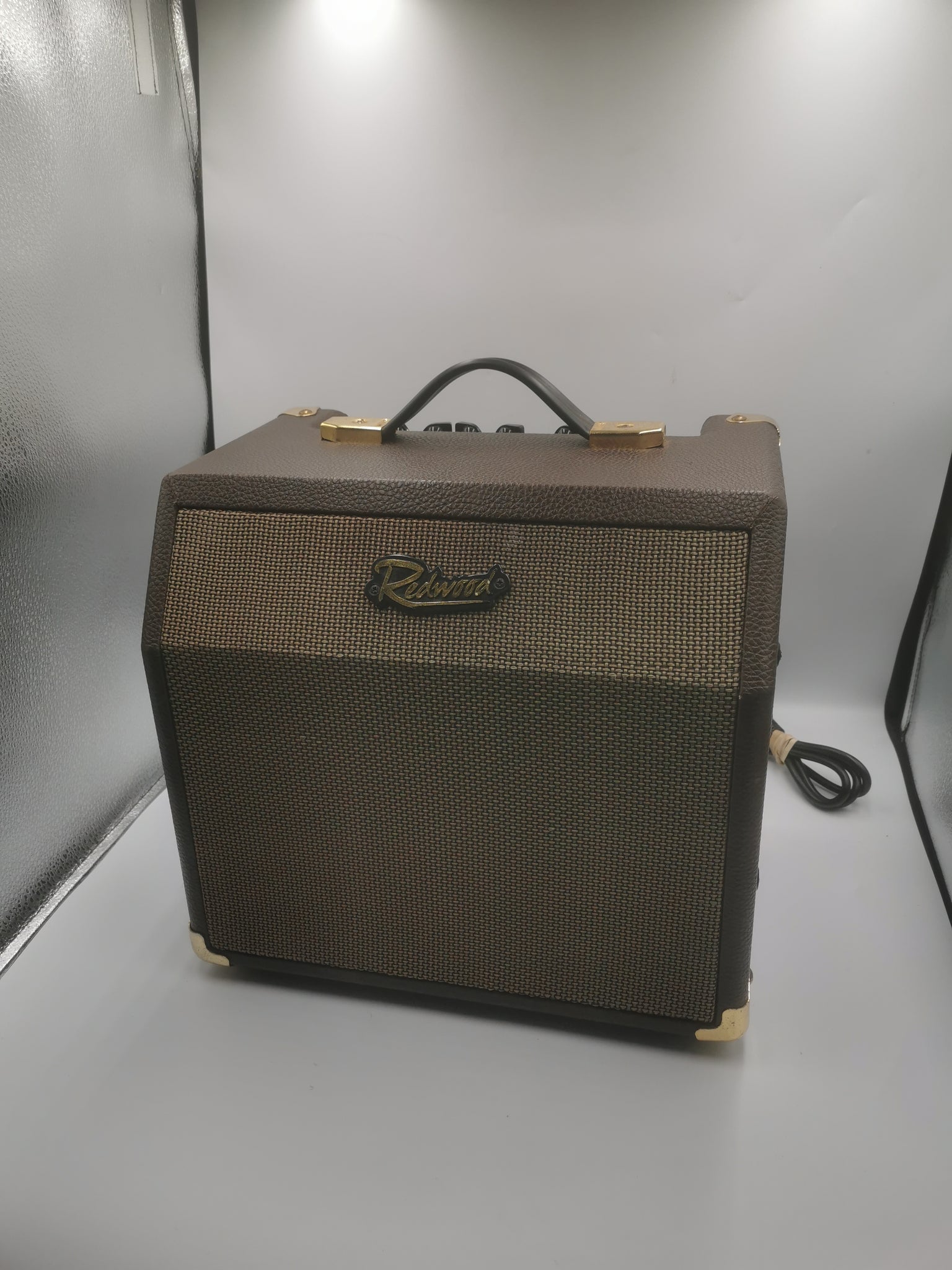 The Redwood Acoustics 15C is a 15-watt acoustic guitar amplifier with dual inputs for a guitar and microphone, a specialized 8-inch speaker, and a built-in chorus effect. It is designed for home practice and small performances, with controls for volume, tone (bass, mid, treble), and chorus speed, and also includes a headphone jack for silent practice. Redwood Acoustics 15C Acoustic Guitar Amplifier Guitar and Microphone Inputs: Features both an instrument jack and an XLR microphone jack, allowing you to plug in both your guitar and a microphone at the same time. Controls: Volume: Separate controls for guitar and microphone volume. EQ: Bass, Mid, and Treble controls for shaping your tone. Chorus: A switchable chorus effect with a speed control to add depth and fullness to the sound. Speaker: Equipped with a specialized 8-inch speaker. Headphone Output: Includes a headphone jack for silent practice sessions. Power: 15 watts of nominal power, with a maximum power of 40 watts. Portability: A compact, closed-back unit that is portable and easy to use. Intended Use: Ideal for home practice, small rehearsals, and intimate gigs due to its wattage and features.