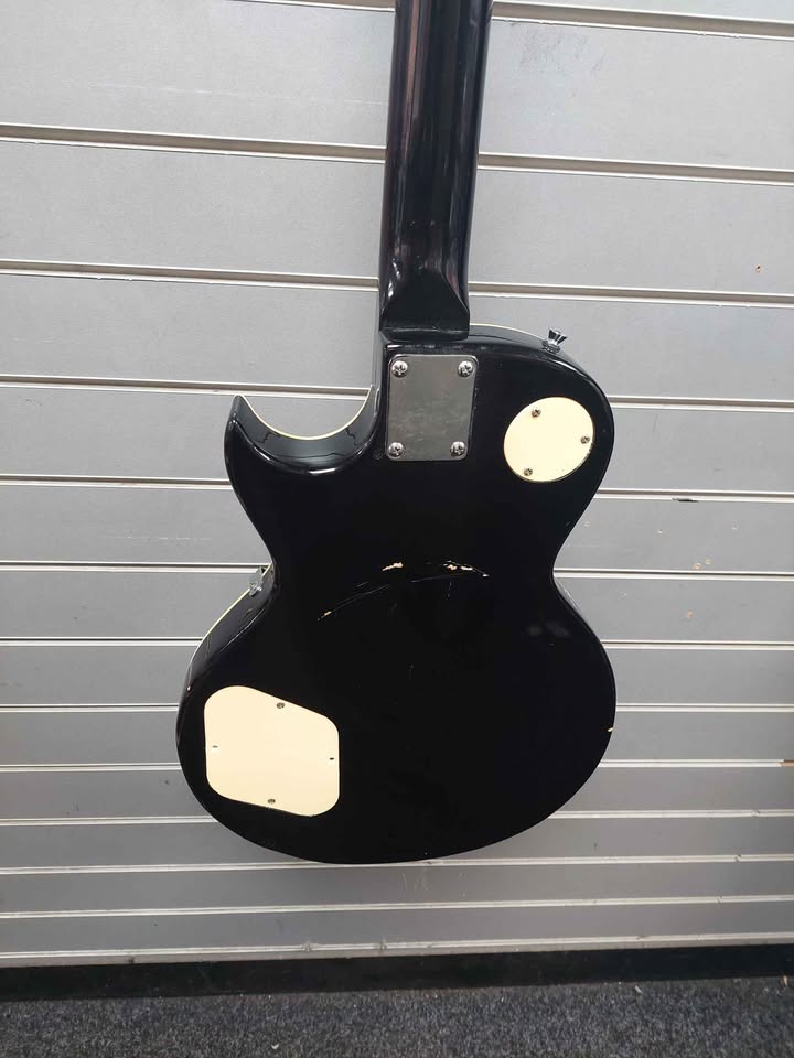 The Encore E99 electric guitar in black is a single-cutaway electric guitar designed for rock music, featuring a basswood body, maple neck, and rosewood fingerboard. It includes two "Guitar Tech" humbucker pickups, a Tune-o-matic bridge with stop bar tailpiece, and a classic control layout of two volume and two tone knobs plus a three-way selector switch. It is often marketed as an excellent beginner or "first serious" rock guitar due to its playability, versatile tone, and value. The E99 is positioned as an ideal starter guitar for beginners, especially those interested in rock music. It is considered a good value and a step up from a basic starter instrument.