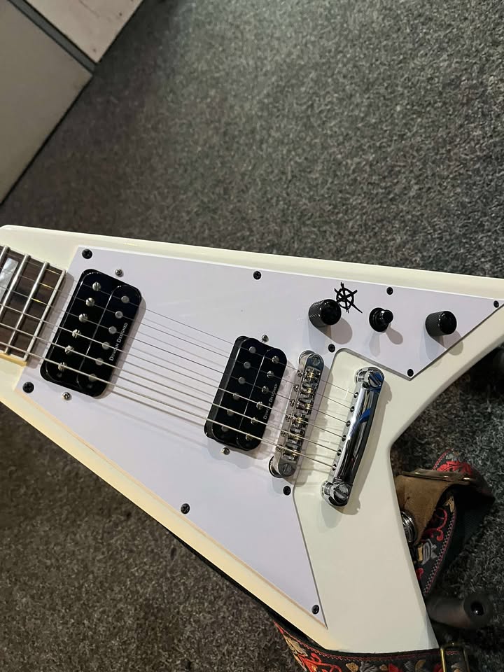 JACKSON KVTMG PRO KING V SNOW WHITE Mahogany body Maple neck Pearloid sharkfin inlays 22 jumbo frets EMG 81 bridge pickups EMG 85 neck pickups Jackson sealed die-cast locking machine heads Comes in soft carry case