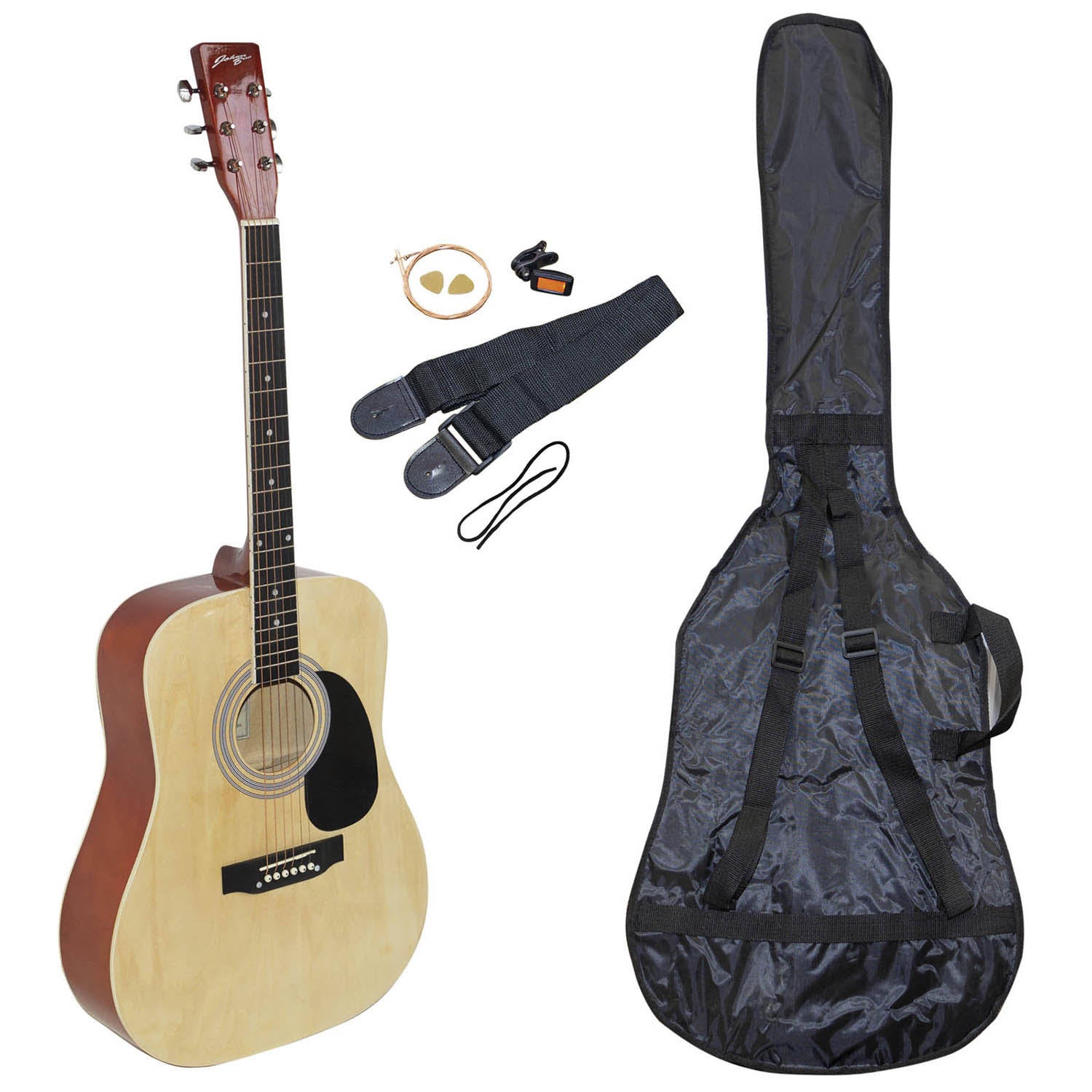 A natural coloured acoustic guitar bundle, including all youll need to begin homeschooling yourself how to play the acoustic guitar.The acoustic guitar itself is an entry point instrument, designed to spark the creativity of anybody looking to learn a new skill. The 22 fret, wooden finish acoustic guitar bundle includes plectrums, a soft carry case, a guitar strap, an extra set of strings AND a guitar tuner. it's just about all youll need to get yourself started.Learning any instrument takes a lot of focus and patience, so attempting some home tutoring is always a great idea to assess whether this hobby is for you! Once you feel like upgrading your acoustic guitar you can always keep this one as a backup for playing with others or better yet, look online for ways to upcycle the acoustic guitar as a wall decoration or other home decor project.