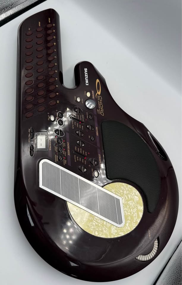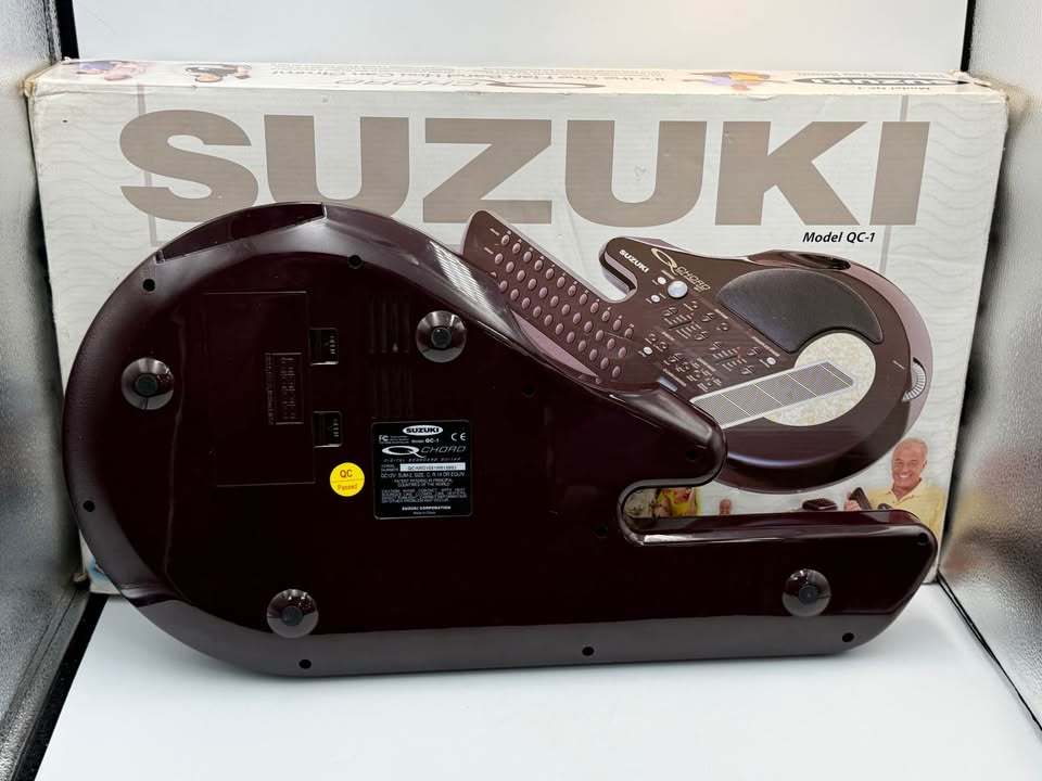 The Suzuki QC-1 QChord is a user-friendly digital instrument combining a keyboard, chord buttons, and a touch-sensitive strum plate, allowing anyone to create music instantly, even without skills, by strumming chords (84 types) and playing melodies on a 49-key keyboard, featuring 109 GM voices, rhythms, pitch bend, and optional song cartridges for a fun, portable musical experience, great for beginners or seasoned players wanting quick, orchestrated sounds. Key Features & Functions: Strum Plate: Touch-sensitive plate to play chords by strumming, offering major, minor, 7th, augmented, and diminished combinations. Chord Buttons: 36 soft-touch buttons for instant chord play. Melody Keyboard: 49-key keyboard with a 4-octave range for single-note melodies, even with an optional overlay. Sounds & Rhythms: 109 General MIDI voices, built-in rhythms (rock, blues, waltz, etc.), and optional song/rhythm cartridges for more. Ease of Use: Features "EZ Play" mode, making it impossible to play wrong notes and great for instant gratification. Portability: Lightweight, battery-powered (or optional adapter), with a built-in speaker and bass port for rich sound. Advanced Features: Pitch bend wheel, reverb, sustain, and line-out for external speakers. How It Works: Choose a Voice: Select an instrument sound (e.g., piano, guitar, strings). Pick a Rhythm: Select a backing beat. Play Chords: Strum the plate or press chord buttons for instant harmonies. Add Melody: Use the keyboard to play single notes over the chords. Use Cartridges: Insert optional cartridges for specific songs or drum styles for a fully orchestrated experience. Ideal For: Beginners, kids, or anyone wanting to make music easily without traditional learning, as well as musicians looking for a fun, creative tool.