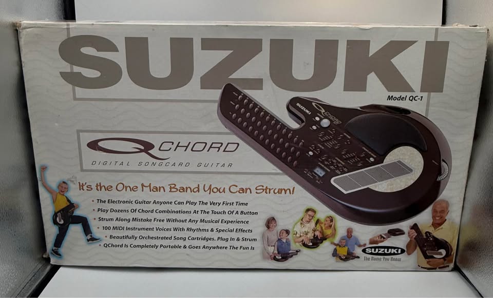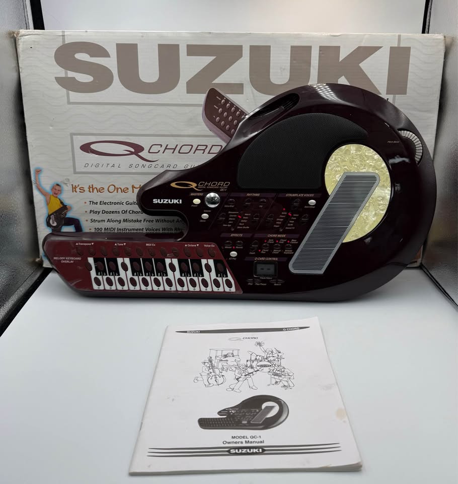 The Suzuki QC-1 QChord is a user-friendly digital instrument combining a keyboard, chord buttons, and a touch-sensitive strum plate, allowing anyone to create music instantly, even without skills, by strumming chords (84 types) and playing melodies on a 49-key keyboard, featuring 109 GM voices, rhythms, pitch bend, and optional song cartridges for a fun, portable musical experience, great for beginners or seasoned players wanting quick, orchestrated sounds. Key Features & Functions: Strum Plate: Touch-sensitive plate to play chords by strumming, offering major, minor, 7th, augmented, and diminished combinations. Chord Buttons: 36 soft-touch buttons for instant chord play. Melody Keyboard: 49-key keyboard with a 4-octave range for single-note melodies, even with an optional overlay. Sounds & Rhythms: 109 General MIDI voices, built-in rhythms (rock, blues, waltz, etc.), and optional song/rhythm cartridges for more. Ease of Use: Features "EZ Play" mode, making it impossible to play wrong notes and great for instant gratification. Portability: Lightweight, battery-powered (or optional adapter), with a built-in speaker and bass port for rich sound. Advanced Features: Pitch bend wheel, reverb, sustain, and line-out for external speakers. How It Works: Choose a Voice: Select an instrument sound (e.g., piano, guitar, strings). Pick a Rhythm: Select a backing beat. Play Chords: Strum the plate or press chord buttons for instant harmonies. Add Melody: Use the keyboard to play single notes over the chords. Use Cartridges: Insert optional cartridges for specific songs or drum styles for a fully orchestrated experience. Ideal For: Beginners, kids, or anyone wanting to make music easily without traditional learning, as well as musicians looking for a fun, creative tool.