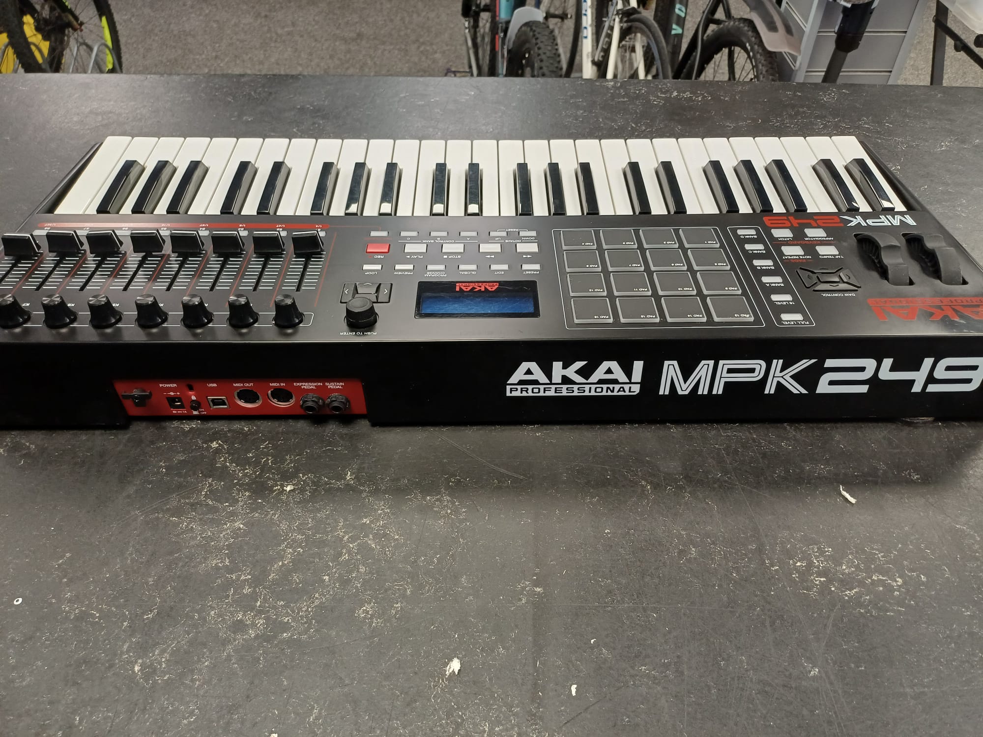 Akai MPK249 MIDI Keyboard Controller 🎹 Professional Control, Seamless Creativity - 49 semi-weighted keys – Full-size, velocity-sensitive keys with aftertouch for expressive playing. - 16 RGB-backlit MPC pads – Velocity and pressure-sensitive pads for dynamic beat-making, sampling, and triggering. - 8 assignable knobs and faders – Hands-on control of virtual instruments, effects, and DAW parameters. - Comprehensive transport controls – Play, stop, record, and navigate your projects directly from the controller. - MPC-inspired features – Includes note repeat, arpeggiator, and full level for intuitive beat production. 💡 Why It’s for You - Producers and beatmakers – Perfect for crafting beats, triggering samples, and controlling your DAW. - Keyboard players – Ideal for musicians who want expressive keys paired with powerful MIDI control. - Studio and stage performers – Portable and versatile for both live performance and studio setups. 🔌 Extras - Built-in arpeggiator – Create complex patterns and melodies effortlessly. - USB-powered – No external power supply required for easy setup anywhere. - Compatible with major DAWs – Works seamlessly with Ableton Live, Logic Pro, FL Studio, and more.