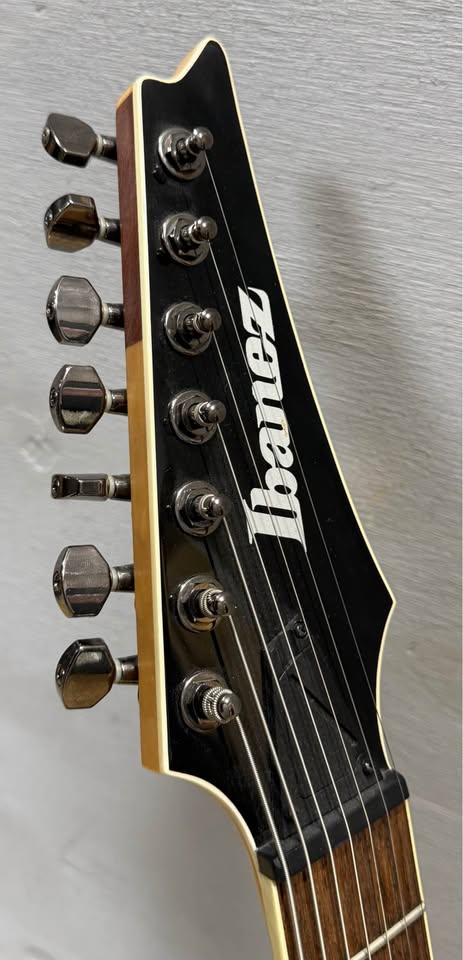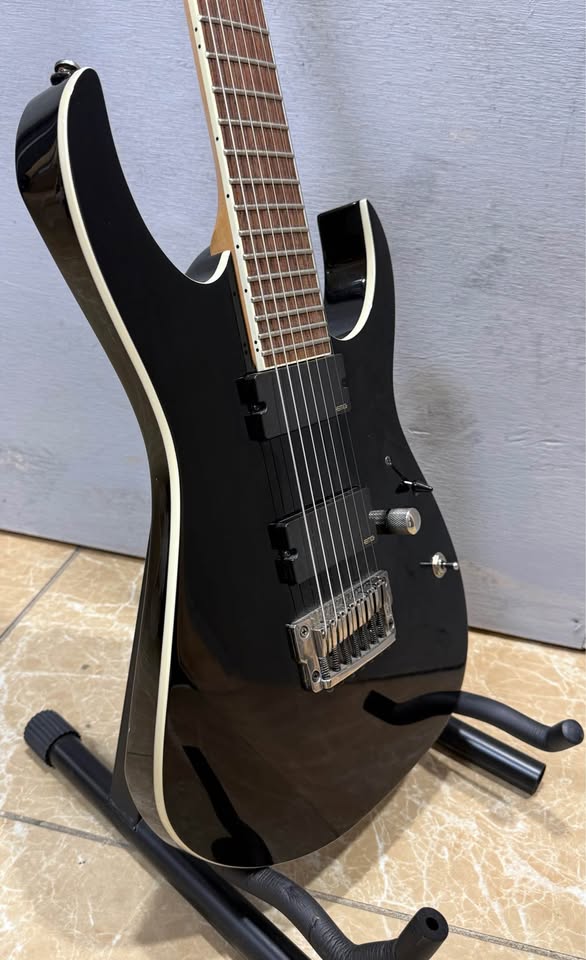 The Ibanez RGIR27FE Iron Label is a 7-string electric guitar built for modern metal, featuring a resonant basswood body, a fast Nitro Wizard-7 neck with 24 jumbo frets on a bound rosewood fretboard (no inlays), active EMG 707 pickups for heavy tones, a Gibraltar Standard-7 fixed bridge for tuning stability, and a kill switch for rhythmic effects. It combines aggressive looks with high-performance features, focusing on playability and powerful sound for drop-tuned riffs and shredding. Key Features: Body: Basswood, RG body shape with black binding. Neck: 3-piece Maple/Bubinga, Nitro Wizard-7 shape (thin, fast). Fretboard: Bound Rosewood, 24 Jumbo Frets, No Inlays. Pickups: Active EMG 707 Humbuckers (Neck & Bridge). Bridge: Gibraltar Standard-7 Fixed Bridge. Controls: 1 Volume, 3-Way Pickup Switch, Kill Switch. Hardware: Cosmo Black. Construction: Bolt-on (AANJ). Scale Length: 25.5".