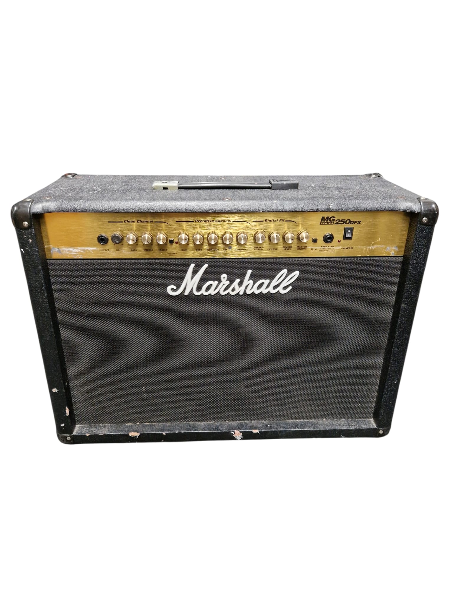 The Marshall MG250DFX is a 100-watt (2x50W stereo) solid-state combo amplifier featuring two 12-inch speakers, designed for versatility in practice, recording, and live performances. It includes twin footswitchable channels (Clean/Overdrive), built-in digital effects (Chorus, Delay, Flange, Reverb), and FDD (Frequency Dependent Dampening) technology.