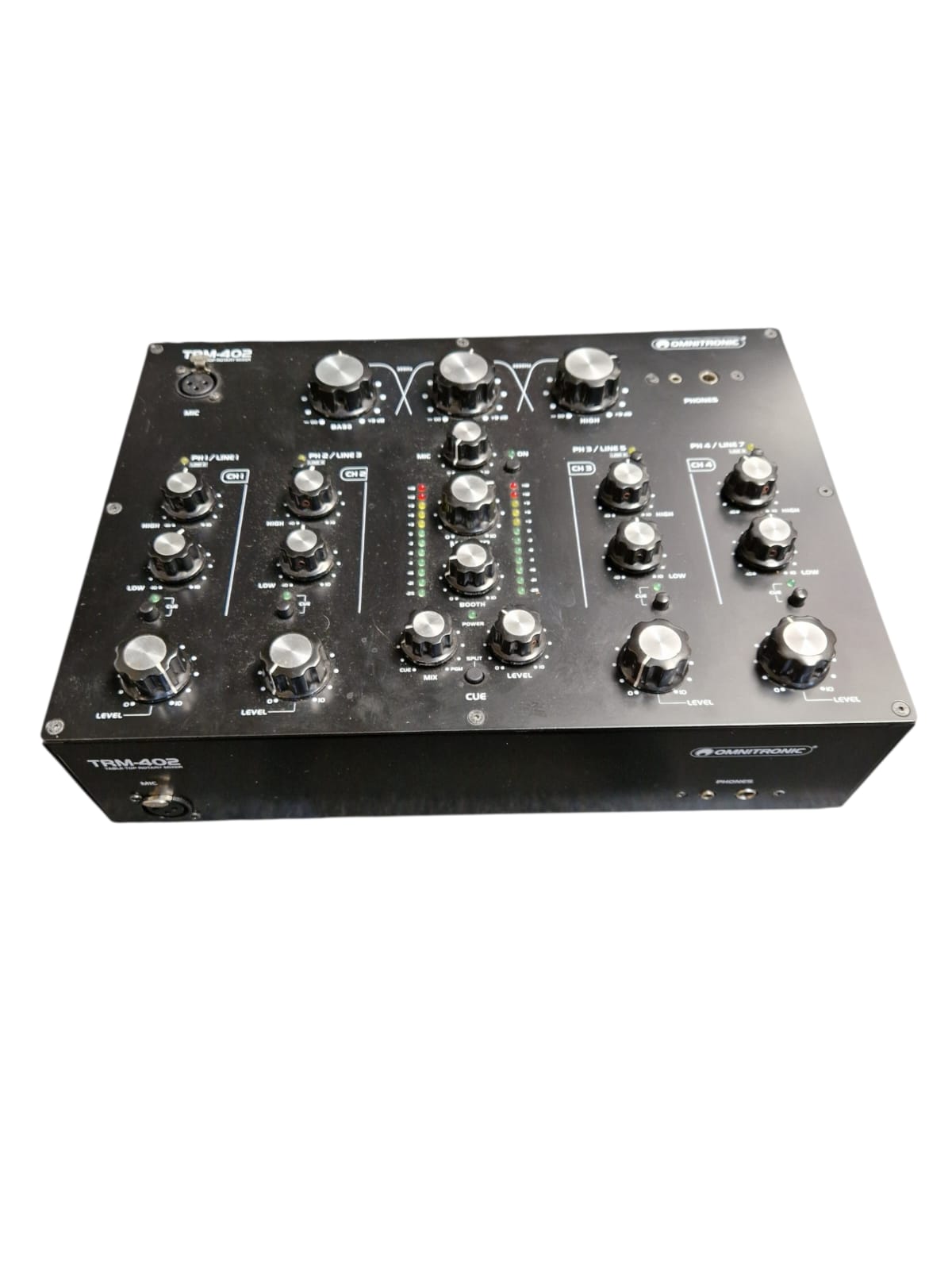 The 2-channel version of this mixer, the TRM-202 MK3 from Omnitronic, has gained worldwide popularity, especially among DJs in electronic music. The TRM-402 4-channel rotary mixer expands this popular concept by adding 2 channels: now, nothing stands in the way of a creative 4-deck DJ set or seamless transitions during a gig. Of course, this version also incorporates the classic features of a rotary mixer, featuring ALPS rotary knobs (Blue Velvet RK27) and a 3-band frequency isolator. The high-quality components of the TRM-402 ensure an appealing sound profile. The large rotary knobs for the 4 channels allow the DJ to create very smooth transitions, which are difficult to achieve with a conventional mixer (with faders). All channels can switch between line and phono inputs or sources. There is also a microphone input available. The kill characteristics of the isolator allow for the complete elimination of bass, mids, and highs, enabling creative mixing. The TRM-402 is equipped with a booth output and a separate volume control, making its use in clubs hassle-free. Additionally, the record output allows for the possibility of recording your own DJ set.