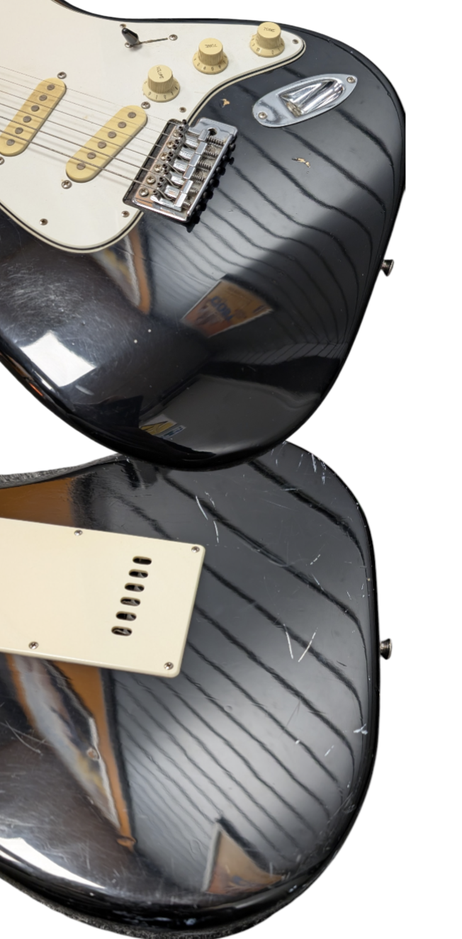 These guitars were made in India under licence with Fender. This is one of the 1st generation models from the 1980's, and are hidden gems by those in the know. This guitar features a solid body in Black, and has a maple neck and rosewood fretboard, along with 3 single coil pick ups, 1 Volume and 2 Tone Pots