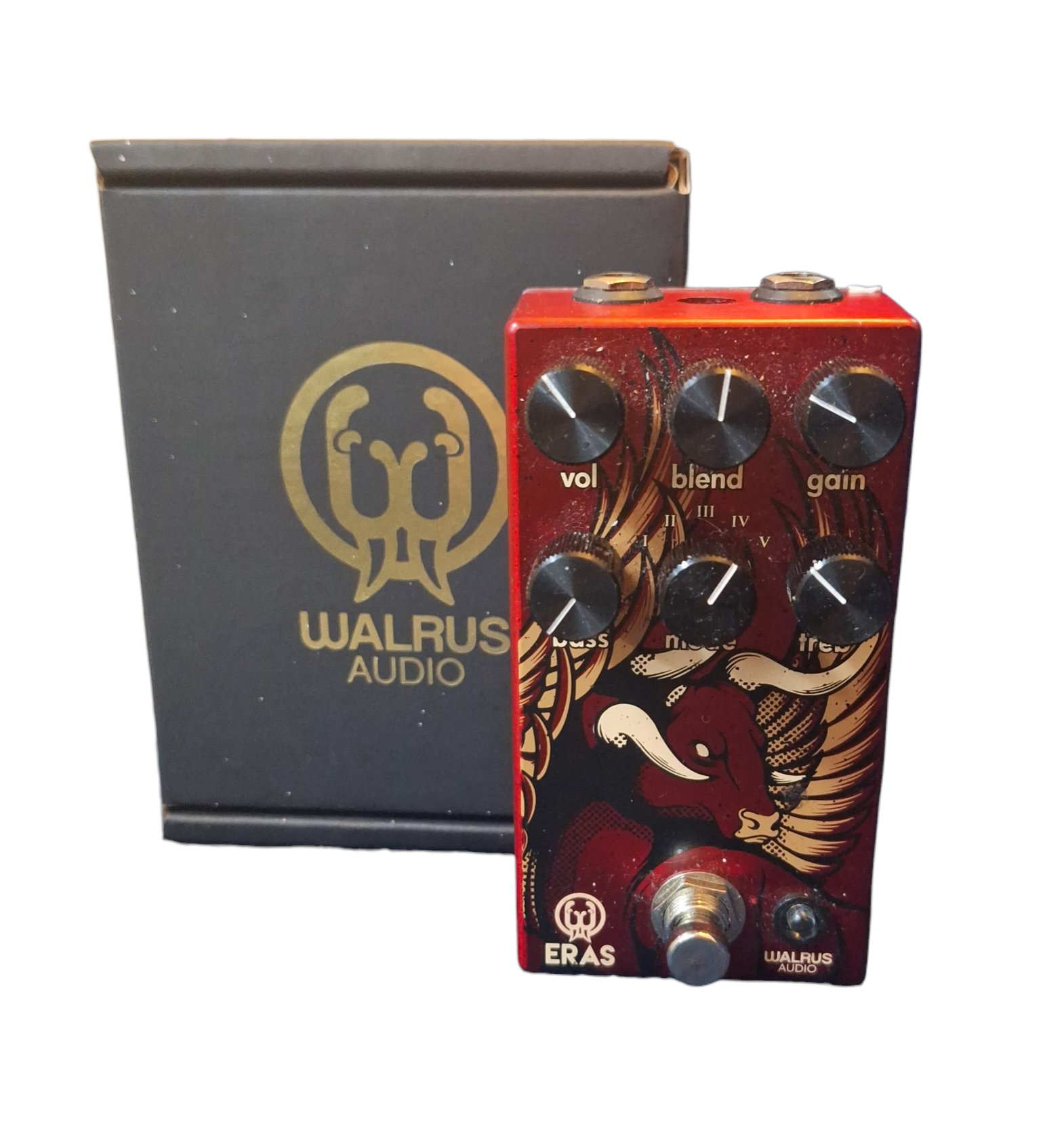 Walrus Audio Eras is a high-gain distortion pedal designed for guitarists and bassists seeking rapid response and tonal flexibility. It features a five-position rotary switch for different distortion modes, a dry/wet blend knob, and active bass and treble controls. The pedal's robust design includes true bypass and top-mounted jacks, making it easy to integrate into any setup. The translucent red casing with art by Adam Forster adds a unique touch. Ideal for energetic riffs, precise palm muting, and expressive leads.
