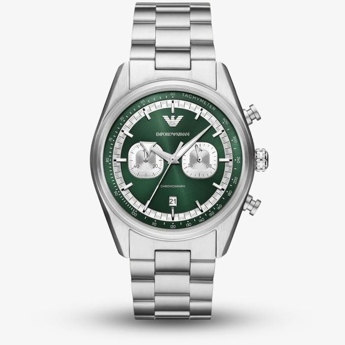 A sporty and stylish chronograph watch featuring a striking green dial, silver tone sub dials and a date window. Complemented by a stainless steel bracelet with a water resistance of up to 50m, this watch is perfect for everyday wear and is both fashionable and functional. • Powered by the quartz movement. • Presented on a silver stainless steel bracelet with fold over clasp. • Mineral crystal glass. • 42.0mm case width. • 50 metre water resistance.