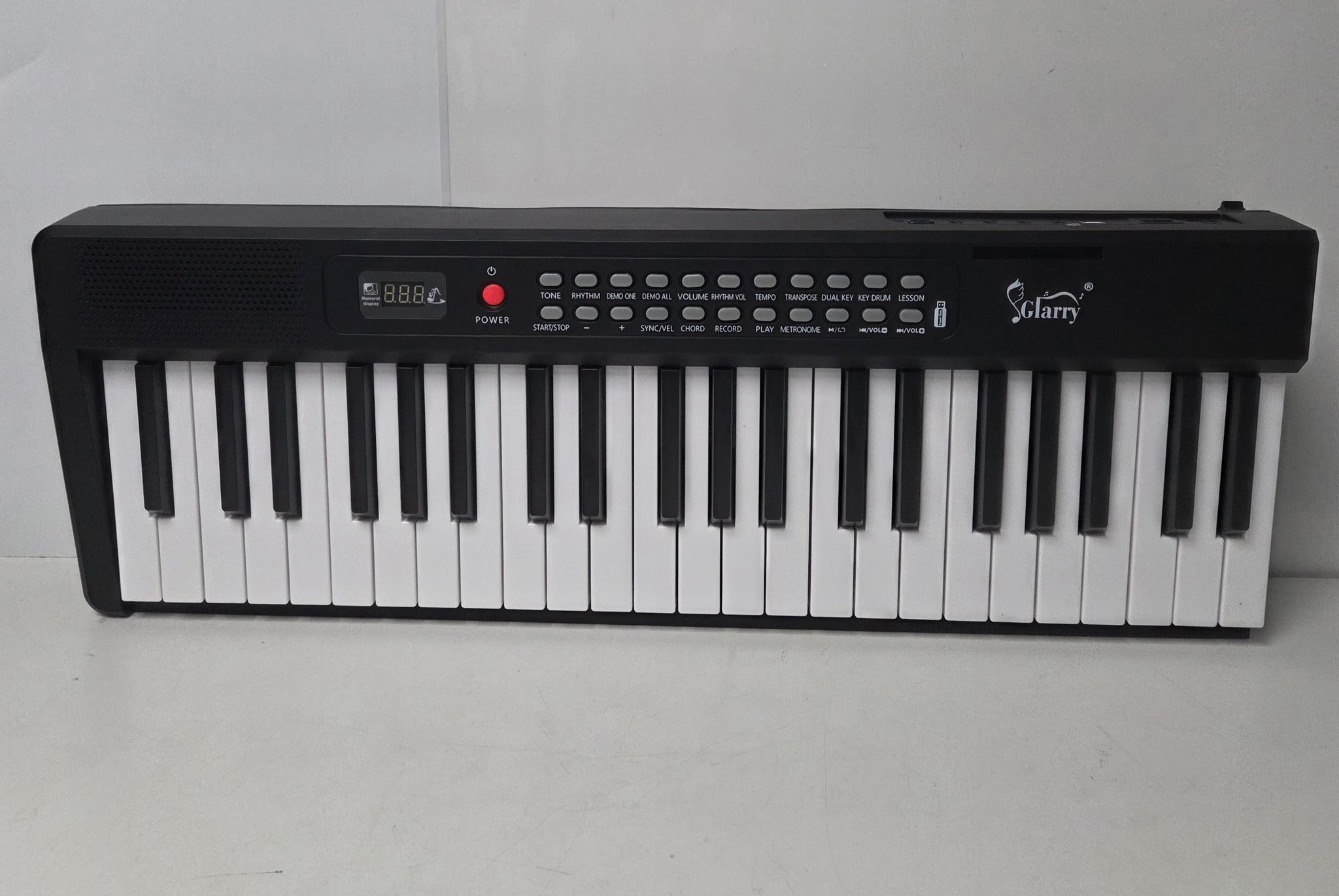 Glarry GEP-106 61 Key Portable Keyboard complete with 600 timbres, 400 rhythms, 30 demo songs and LCD display with 3 teaching modes(Single-finger; Follow; Concert), it's perfect instrument for a beginning player. Complete with built-in two stereo speakers provide excellent sound quality, At the same time we also give away one headphone so you don't worry will disturb others' relax when you are playing.GEP-106 61 Key Portable Keyboard provides 2 ways to power: DC 12V or 6 pcs AA batteries (not included) and you can play music anywhere! At the same time, we have functions: USB Music Player; Support Audio input; Master Volume Control; Accompanied Volume Control; Transposition; Tempo; Record; Playback; Demo one; Demo all; Sustain; Vibrato; Metronome etc