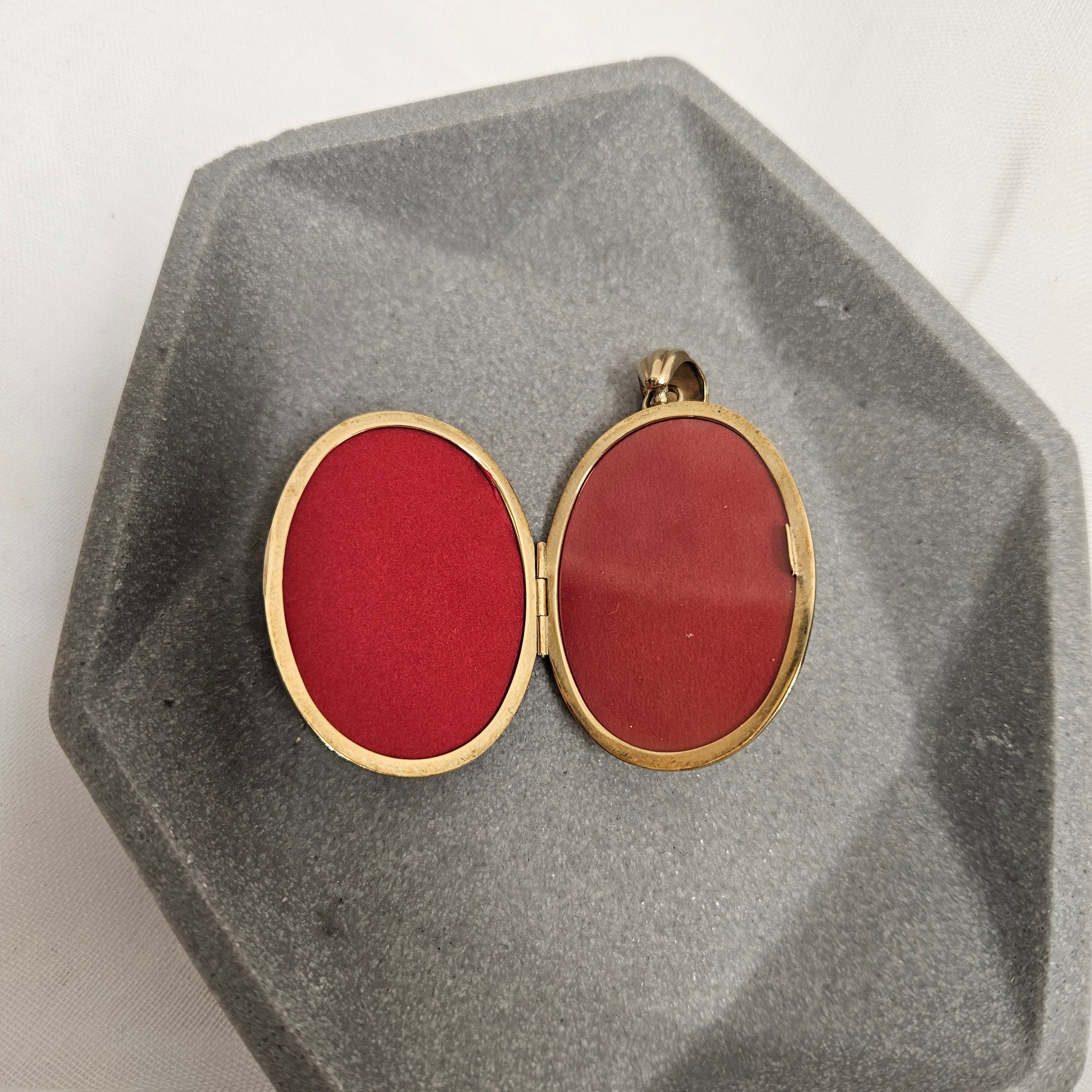 This stunning 9ct yellow gold locket pendant is 6cm in total length and 4cm wide. Total weight is 16.5g including the fabric and the plastic covering for the photo. This item will be sent tracked via Royal Mail and will come in a gift box.