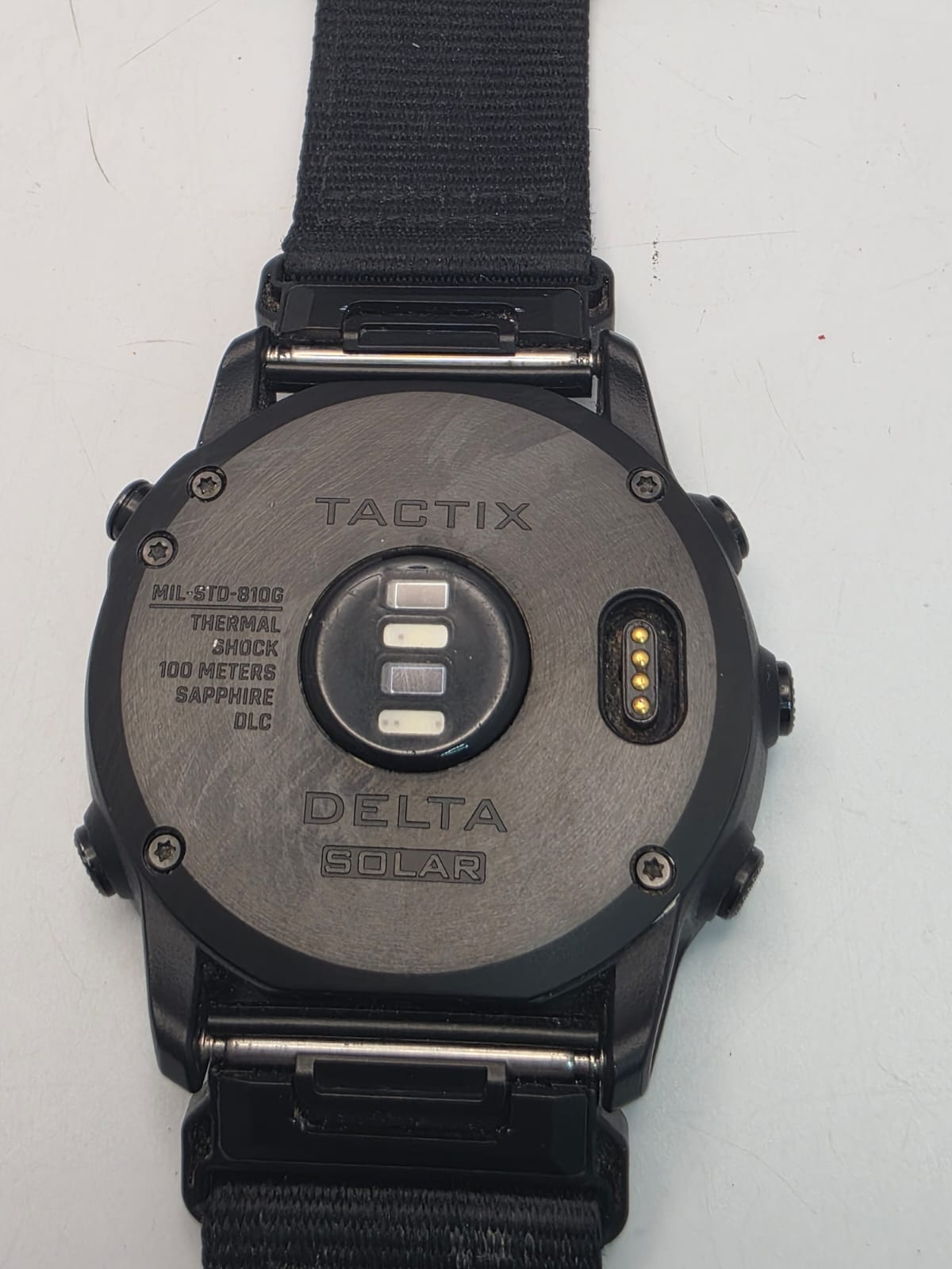 Make: GARMIN Model: TACTIX DELTA SOLAR - PREMIUM TACTICAL GPS WATCH Connectivity: GPS Size: 51MM Colour: BLACK Supplied with: BOX + CHARGING CABLE Description: GOOD CONDITION - SHOWS SIGNS OF USE- FULLY TESTED - STRAP SHOWS SIGNS OF USE