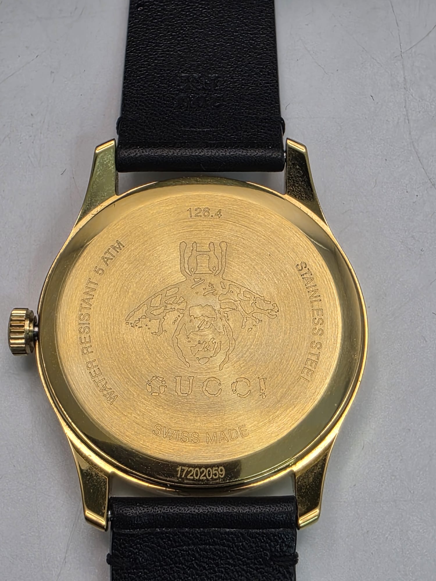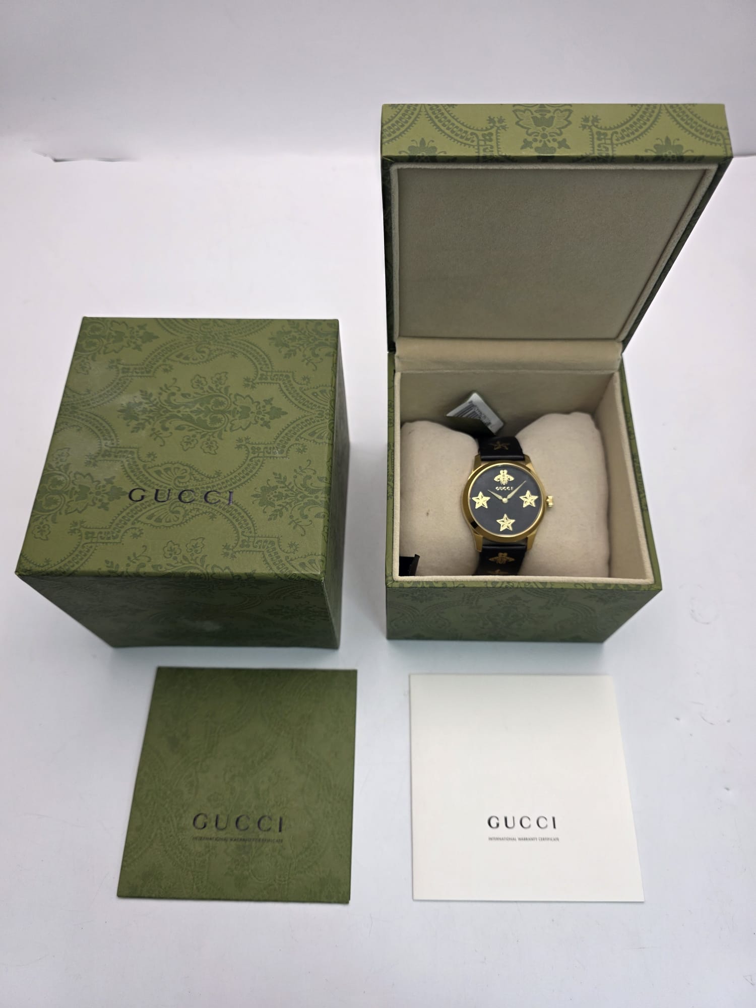 Cash Generator Nottingham Find us online or contact us for questions! Make: GUCCI Model: G-Timeless Women's Black Dial Leather Strap Watch - YA1264055 Size: 38mm Movement Type: Quartz Supplied with: Box + Paperworks Description: Excellent condition - Boxed