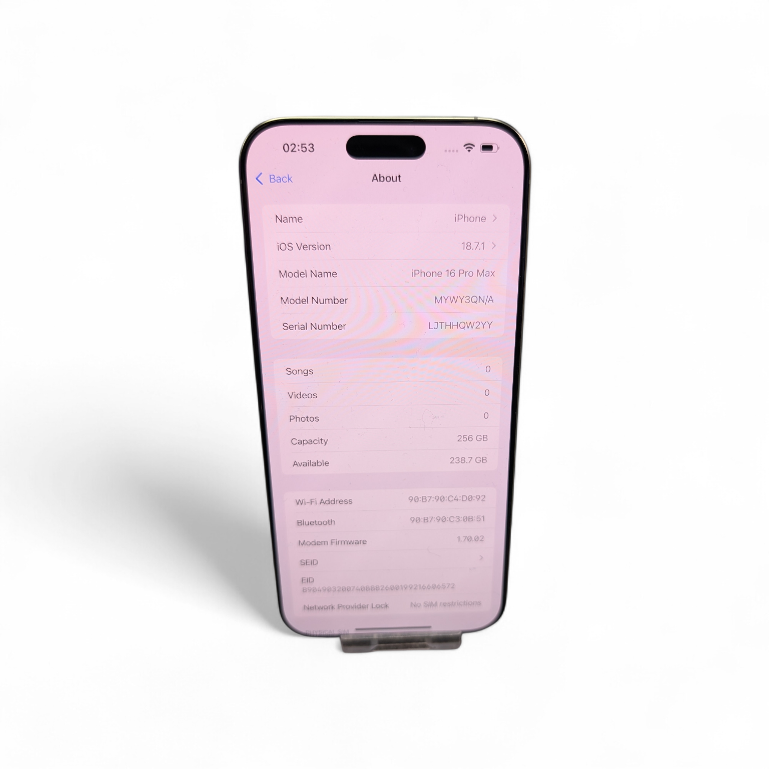 HERE WE HAVE AN APPLE IPHONE 16 PRO MAX SMART MOBILE PHONE. THIS COMES UNBOXED FEATURING 256GB MEMORY AND 100% BATTERY HEALTH AND A 55 CYCLE COUNT. *** FOR ANY QUERIES PLEASE CALL OUR PRESTON STORE DIRECT MON-SAT 01772204889