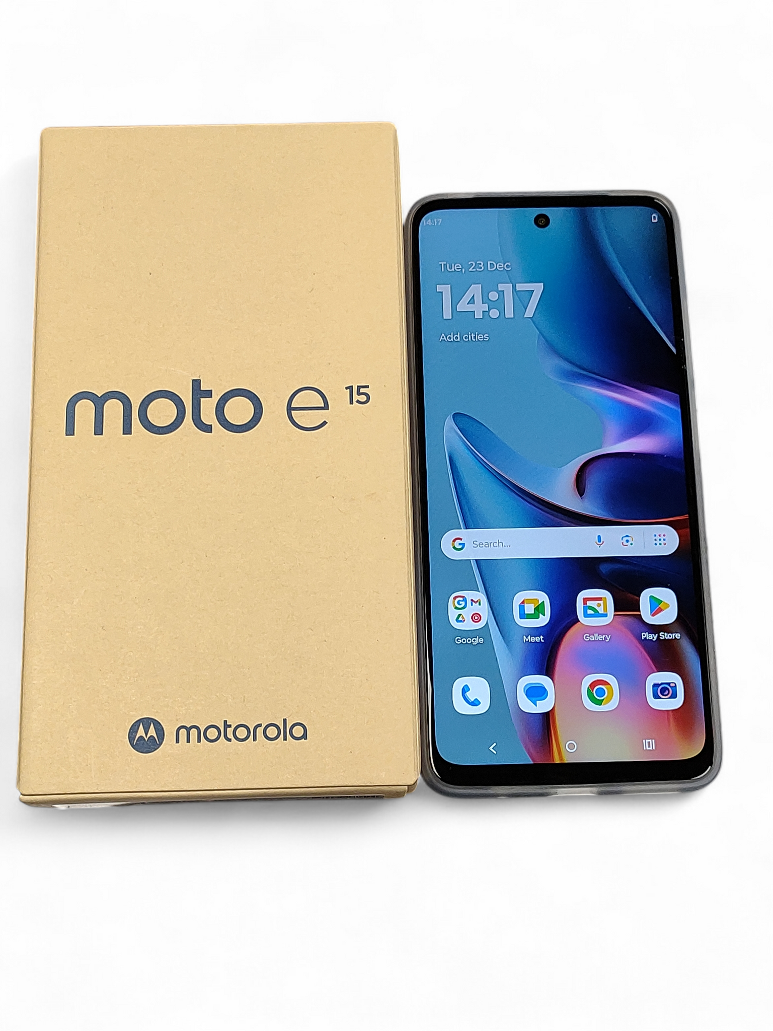 Give your entertainment a boost of brilliance with the new moto e15. Watch programmes and films on a super-bright 6.67" 90Hz display. And listen to sound all around thanks to powerful stereo speakers with bass boost. Capture beautifully sharp photos day or night with the AI-powered 32 MP camera system. Plus, you get fast, efficient performance, a vegan leather finish, and a long-lasting 5200mAh battery. Make every day brighter with moto e15. Super-bass speakers, super-bright display. Get stereo speakers with 7x more powerful bass and view your display clearly outdoors in high brightness mode (up to 1000 nits). AI-powered 32 MP camera system. Effortlessly capture incredibly sharp and beautifully detailed photos in any light. Fast, efficient performance with RAM boost. Accelerate your multitasking thanks to up to 6 GB available RAM with RAM boost – without compromising battery life. Premium design crafted from high-quality materials. Enjoy the look and feel of vegan leather, protected by a water-repellent design and Corning Gorilla Glass.
