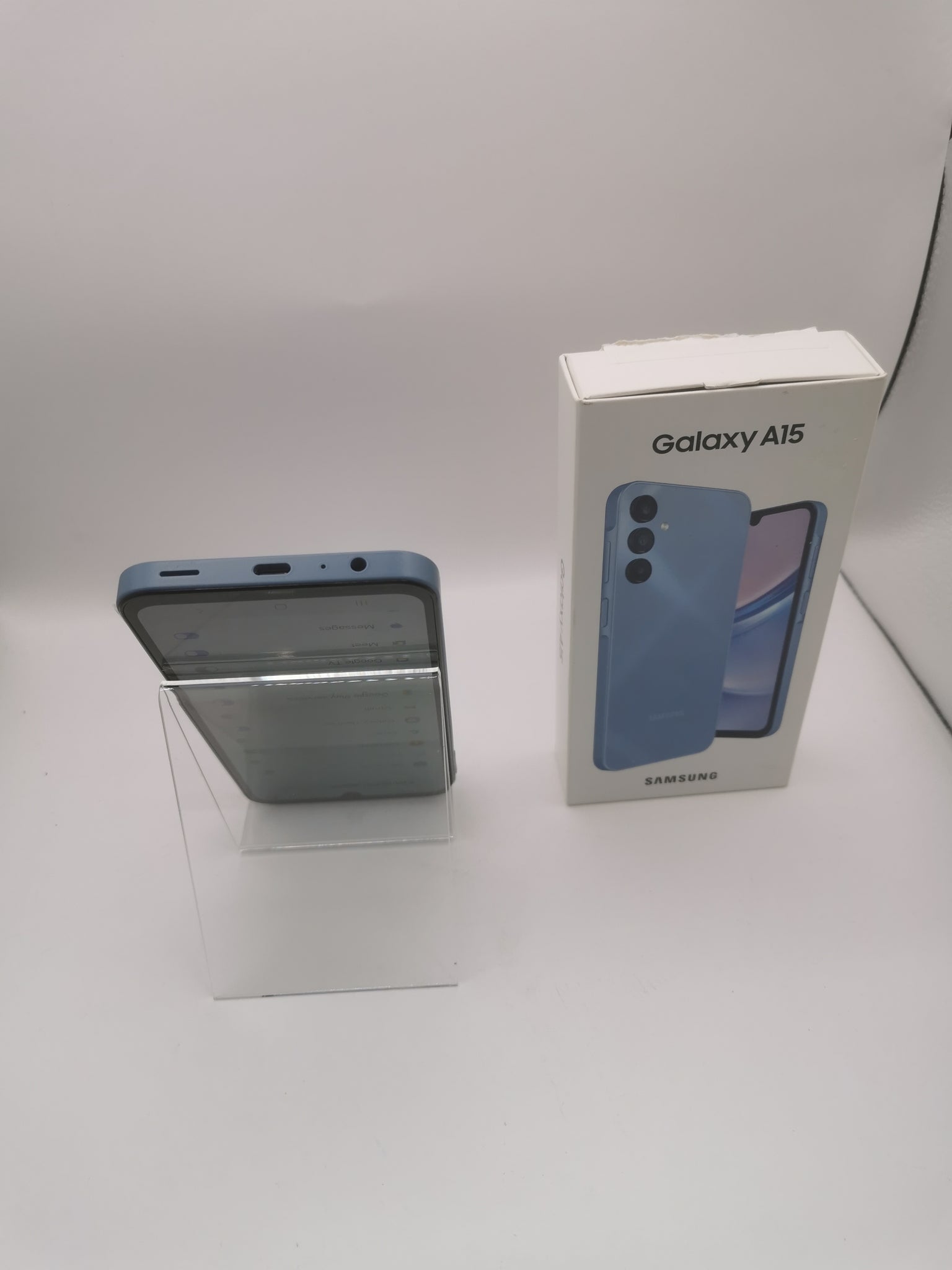 The Samsung Galaxy A15 is a blue, unlocked smartphone with 4GB of RAM and 128GB of storage, featuring a 6.5-inch Super AMOLED display, a 50MP main rear camera, and a 5000mAh battery. It runs on Android 14 and comes with features like a side-mounted fingerprint sensor, a USB Type-C port, and stereo speakers. The 4G version is detailed in the search results as having a 90Hz refresh rate, while the 5G version has an 800-nit brightness with Vision Booster technology and supports 5G connectivity. Display and design Display: 6.5-inch Super AMOLED, FHD+ (1080 x 2340) resolution. Refresh Rate: 90Hz (4G version). Brightness: Up to 800 nits with Vision Booster technology. Blue Light Reduction: Eye Comfort Shield reduces blue light. Design: Features an Infinity-U display with a dewdrop cutout for the selfie camera, a glossy back, and a refined frame. Camera Rear: 50MP main camera, 5MP Ultra Wide, and 2MP Macro. Front: 13MP. Flash: No flash on the rear camera. Performance and storage Processor: Octa-core processor. RAM: 4GB. Internal Storage: 128GB, expandable with a memory card. Operating System: Android 14. Battery Capacity: 5000mAh. Life: Up to a 2-day battery life with moderate use. Connectivity and features Network: 4G LTE and 5G capable (depending on model). SIM: Dual SIM (Nano). Ports: USB Type-C. Audio: 3.5mm headphone jack and stereo speakers. Security: Side-mounted fingerprint recognition. Other Unlocked: Can be used on any compatible network. Color: Available in Blue, Light Blue, and Blue Black. Durability: Not water-resistant.