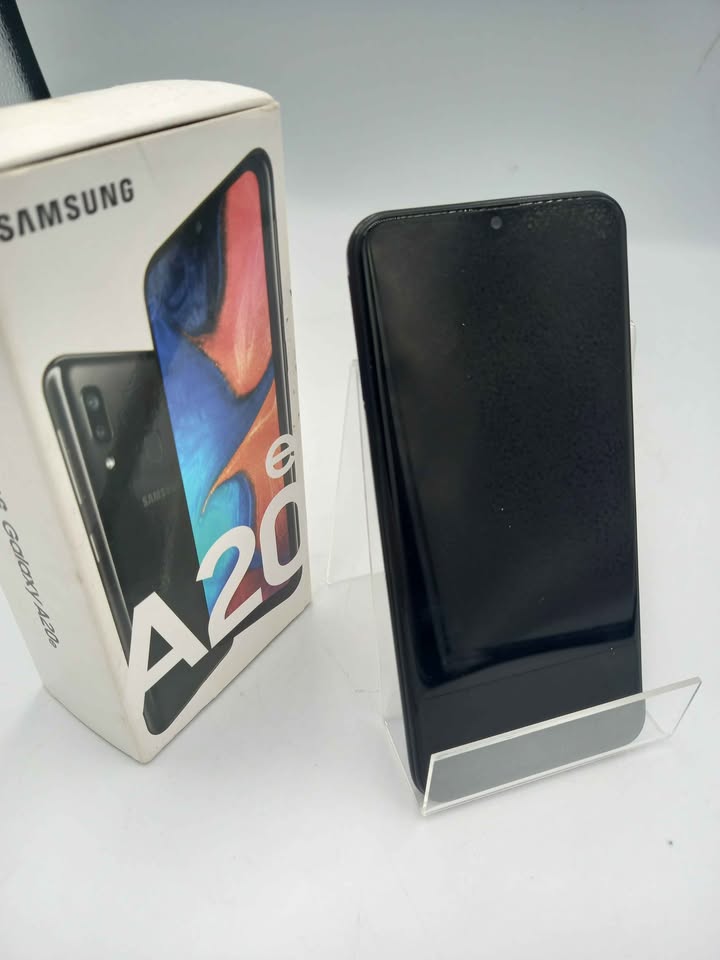 The Samsung Galaxy A20e 32GB in black is a compact, budget-friendly smartphone from 2019 featuring a 5.8" HD+ Infinity-V display, Exynos 7884 processor, 3GB RAM, dual rear cameras (13MP main + 5MP ultrawide), 8MP selfie camera.