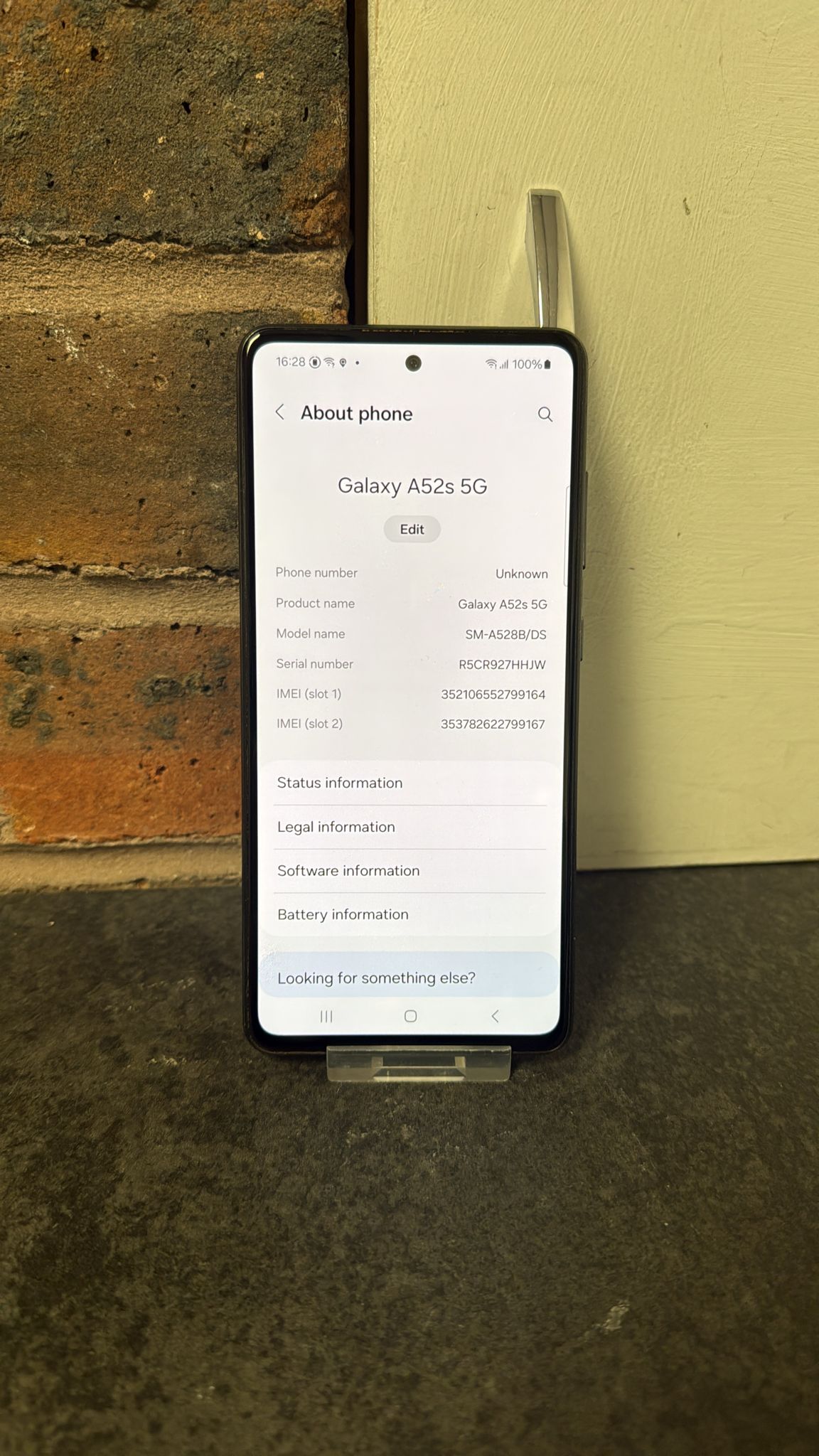 This Samsung Galaxy A52s in Black with 128GB storage is in used condition, showing scratches on the screen along with general signs of use throughout the device. Despite the cosmetic wear, the phone functions as it should and remains a reliable option for everyday tasks.