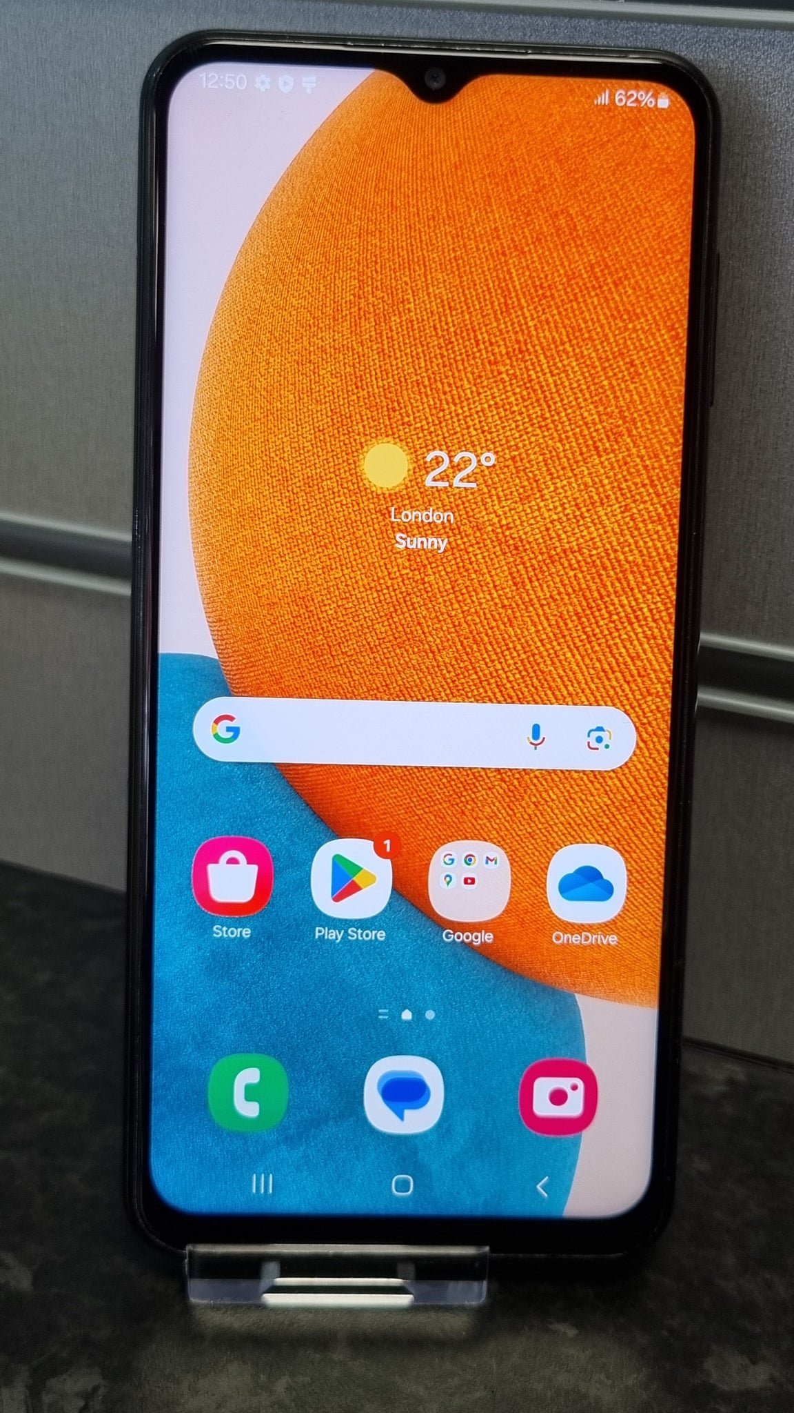 Samsung galaxy A23. 64gb storage. Android 14. This phone has light cosmetic markings from general use. This does not effect performance. Overall good and ready for use. Comes unboxed with compatible charging cable included.