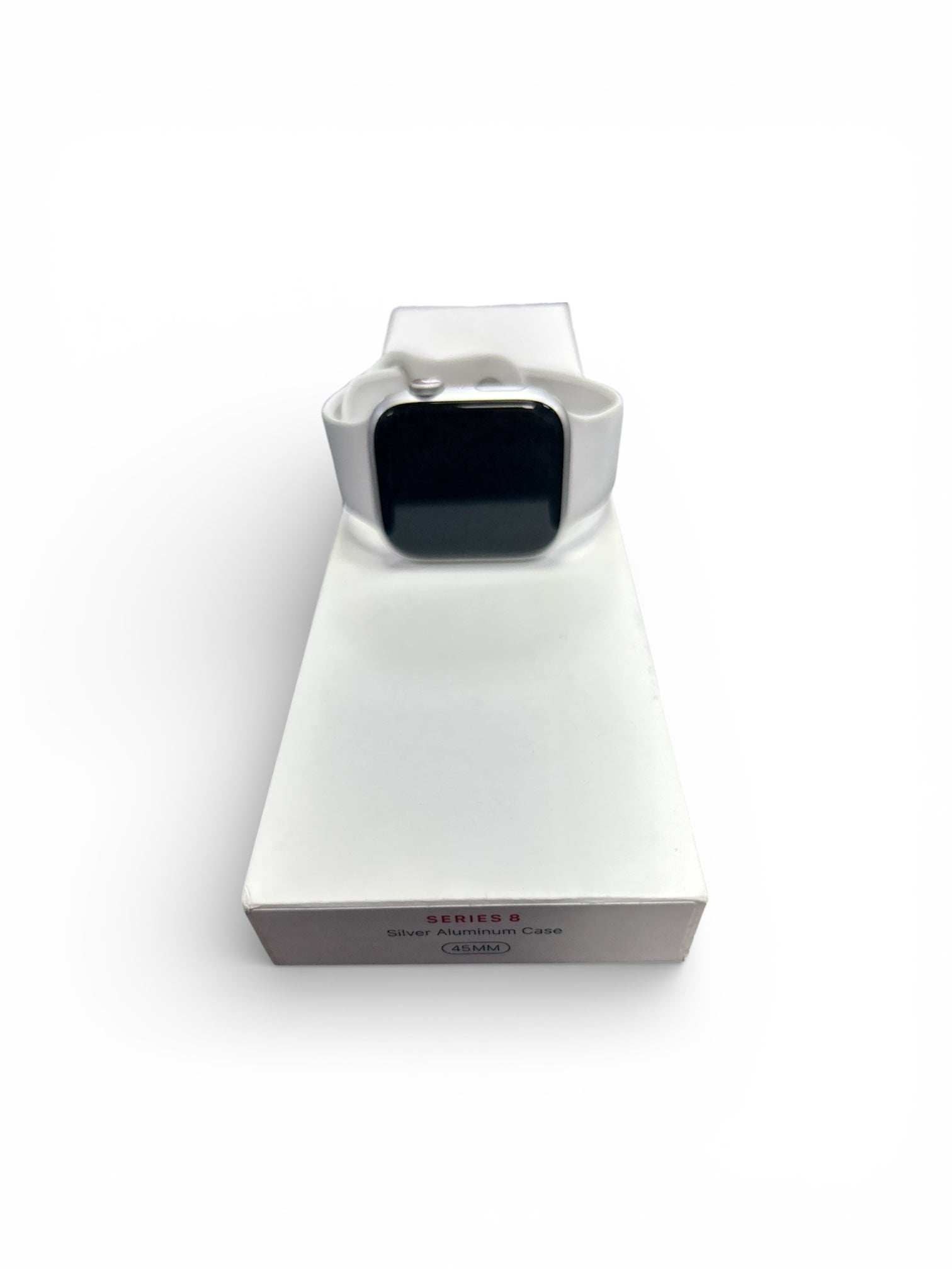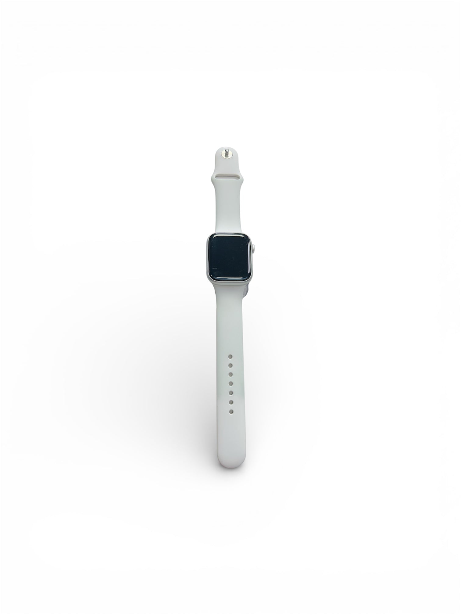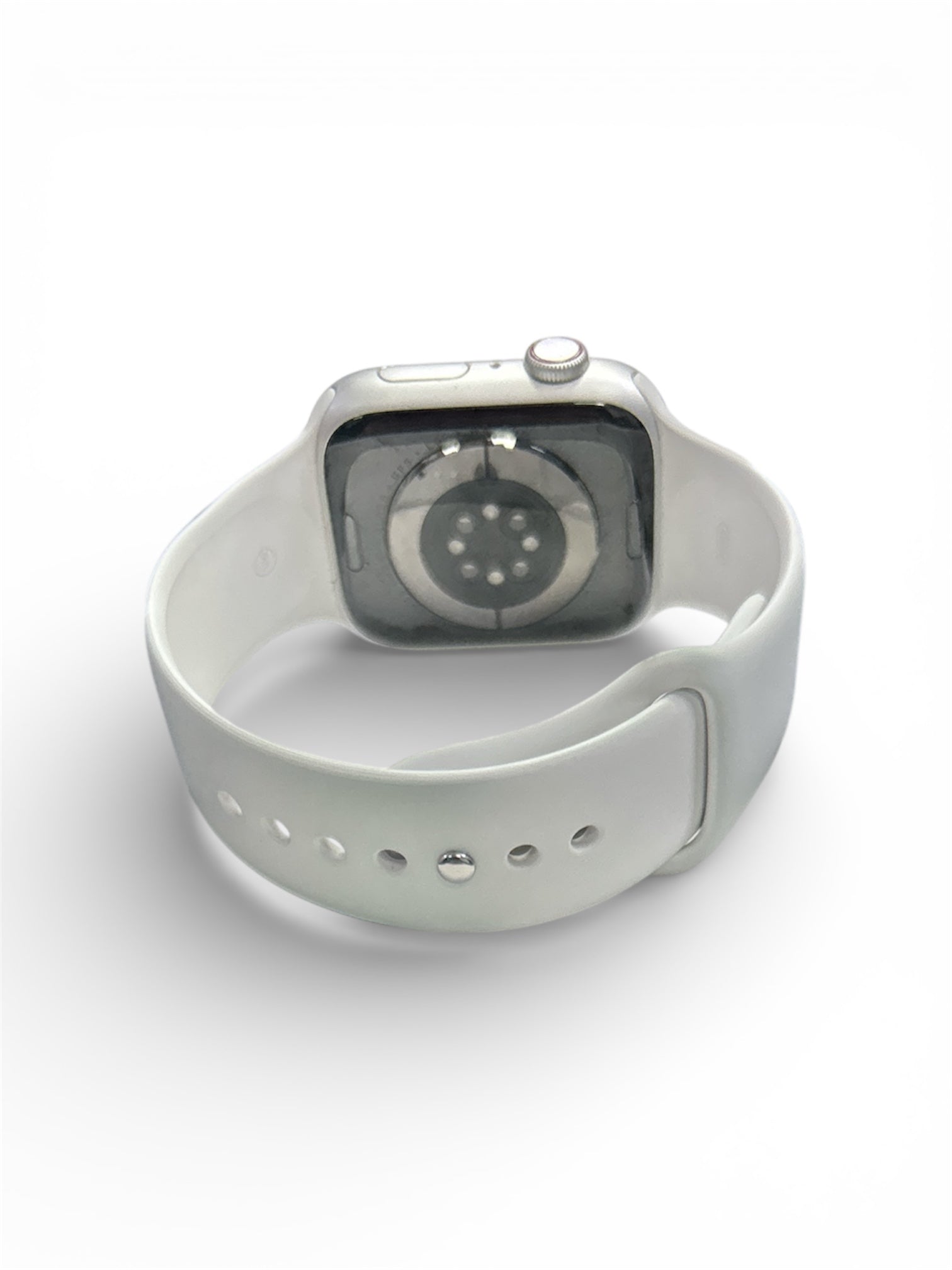 Temperature sensor provides retrospective ovulation estimates and advanced cycle tracking features Measure your blood oxygen with a powerful sensor and app Take an ECG anytime, anywhere Get high and low heart rate, and irregular rhythm notifications Advanced safety features, including Fall Detection, Emergency SOS, and Crash Detection Enhanced Workout app with more advanced metrics and ways to train A completely redesigned Compass app with waypoints and Backtrack Track your daily activity on Apple Watch, and see your trends in the Fitness app on iPhone The most crack-resistant front crystal yet on an Apple Watch, IP6X dust resistance and swimproof design, and increased durability for fitness and activity Call, text, and email with just a few taps Band Color: silver,white Clasp Type: Magnetic Clasp Water Resistance Level: water_resistant Wireless Comm Standard: bluetooth