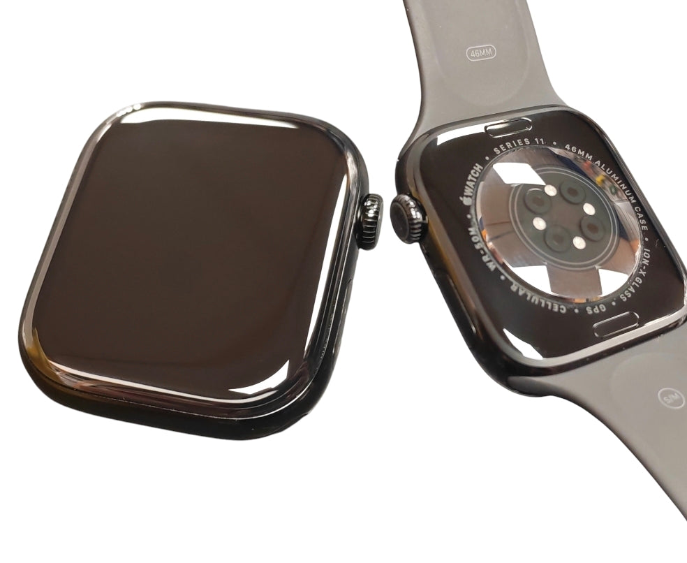 The Apple Watch Series 11 (46mm, GPS + Cellular), released on 19 September 2025, is Apple's first standard series watch to feature 5G connectivity. It retains the thin 9.7mm design introduced with the Series 10 but offers key refinements in battery life and durability. 5G Cellular Connectivity: This model includes 5G RedCap support, providing faster data speeds and better power efficiency when away from your iPhone compared to previous LTE-only models. Extended Battery Life: Official "normal use" battery life has been increased to 24 hours (up from 18 hours on Series 10). Low Power Mode now lasts up to 38 hours. Enhanced Durability: For the aluminium models, the Ion-X front glass is treated with a ceramic coating that makes it 2x more scratch-resistant than the glass on the Series 10. Display: Features a 46mm Always-On Retina LTPO3 wide-angle OLED display with a peak brightness of 2,000 nits and a minimum of 1 nit to save power.