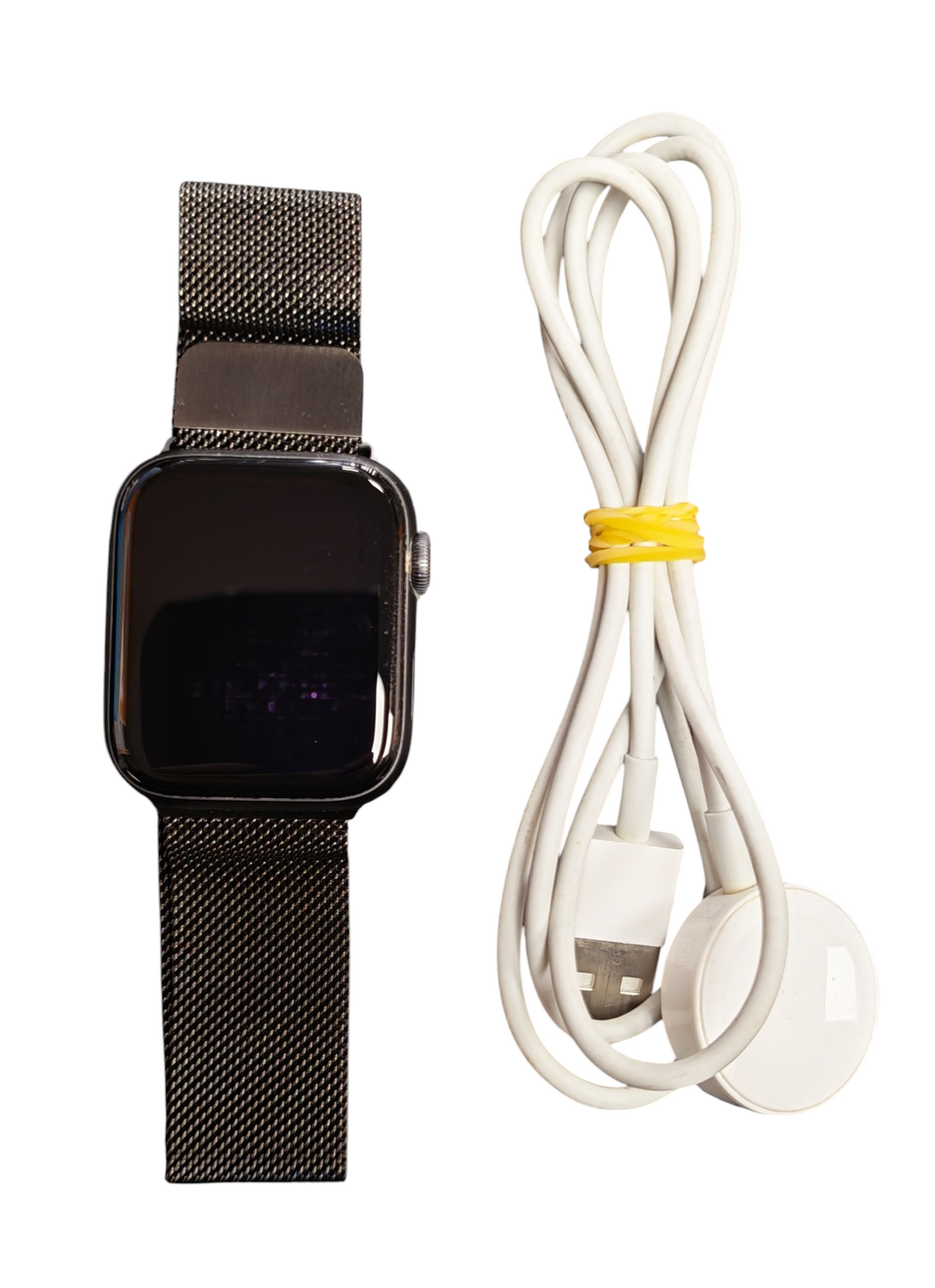 Comes unboxed in good working order with charging wire. Minor signs of use. Not the original strap.