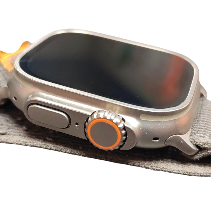The Apple Watch Ultra (1st Gen), released in September 2022, is a 49mm rugged smartwatch featuring a durable titanium case, flat sapphire crystal display, and up to 36 hours of battery life. Designed for endurance, it includes a customizable orange Action button, dual-frequency GPS, 100m water resistance, and dive-ready features.