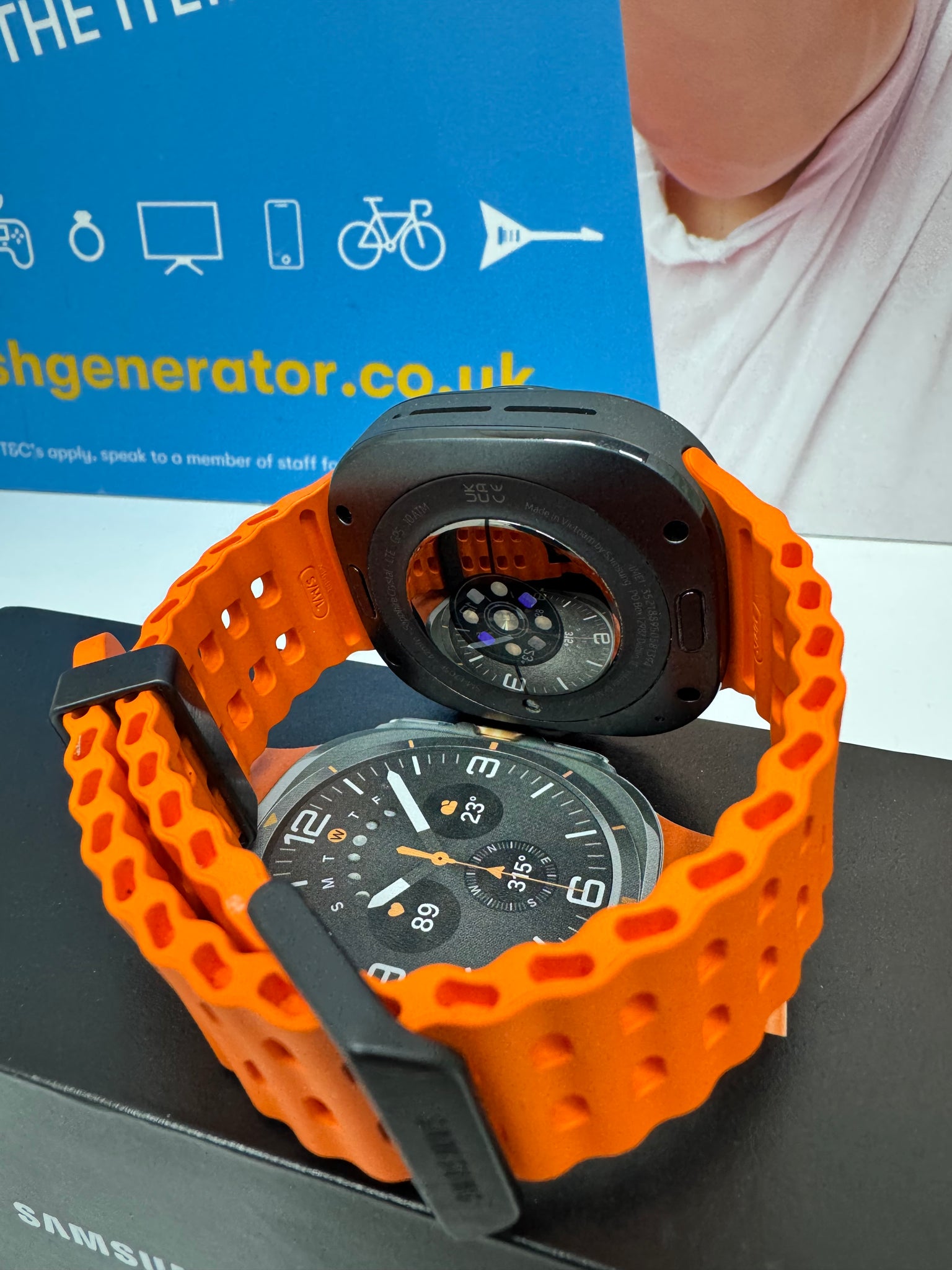 The Samsung Galaxy Watch Ultra 47mm LTE is a stylish smartwatch with a grey titanium case and a comfortable silicone band in orange. It is unlocked for use on any network and is compatible with Android operating systems. Featuring GPS capabilities, this Samsung Galaxy Watch offers a range of features to enhance your daily routine and stay connected on the go.