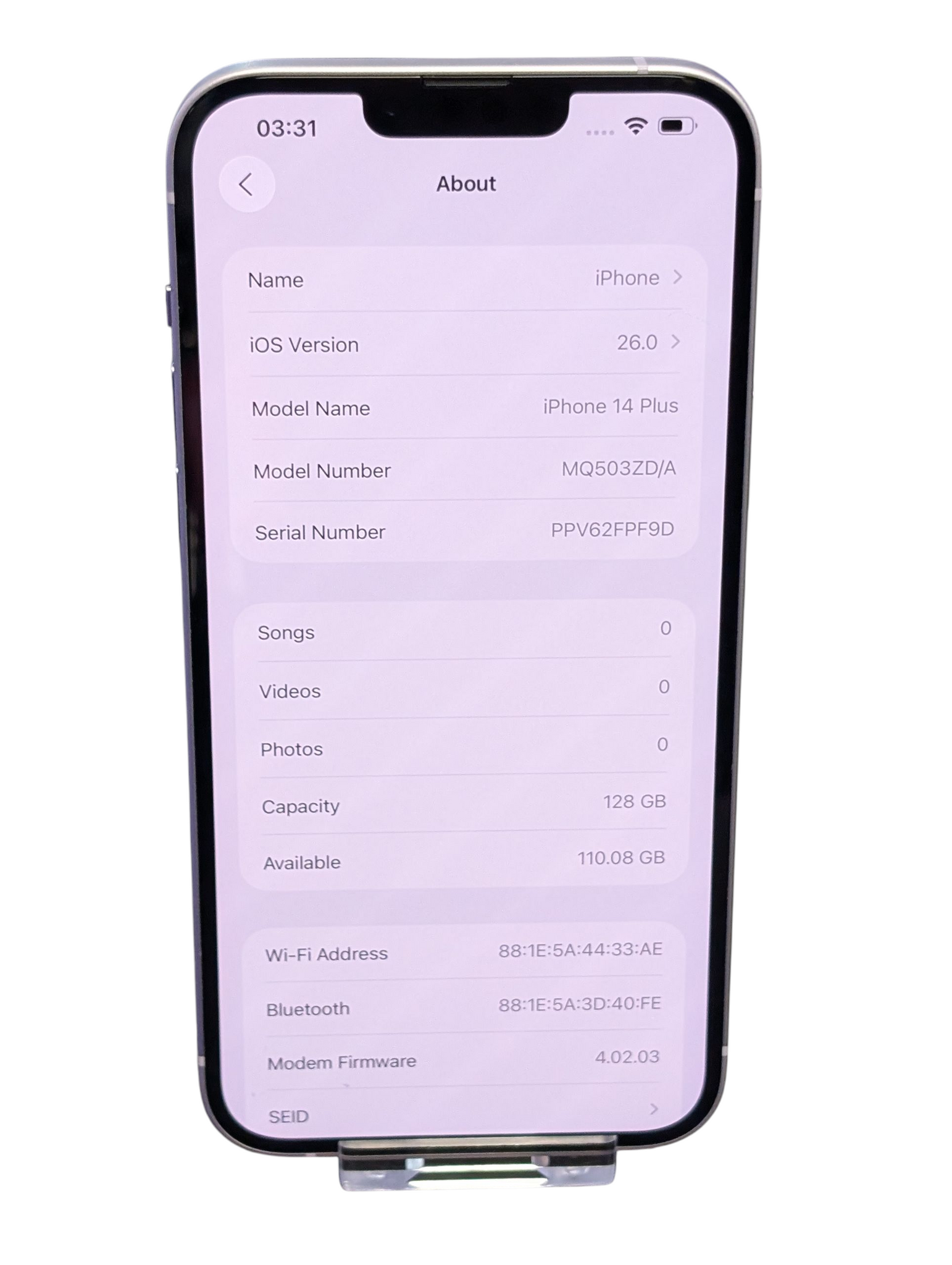 HERE WE HAVE A LILAC IPHONE 14 PLUS MOBILE PHONE COMES UNBOXED WITH USB LEAD AND FEATURES 128GB MEMORY WITH A 86% BATTERY HEALTH. THERE IS A LITTLE LIGHT COSMETIC WEAR FROM GENERAL USE. *** FOR ANY QUERIES PLEASE CALL OUR CHORLEY STORE DIRECT MON-SAT 01257 752333