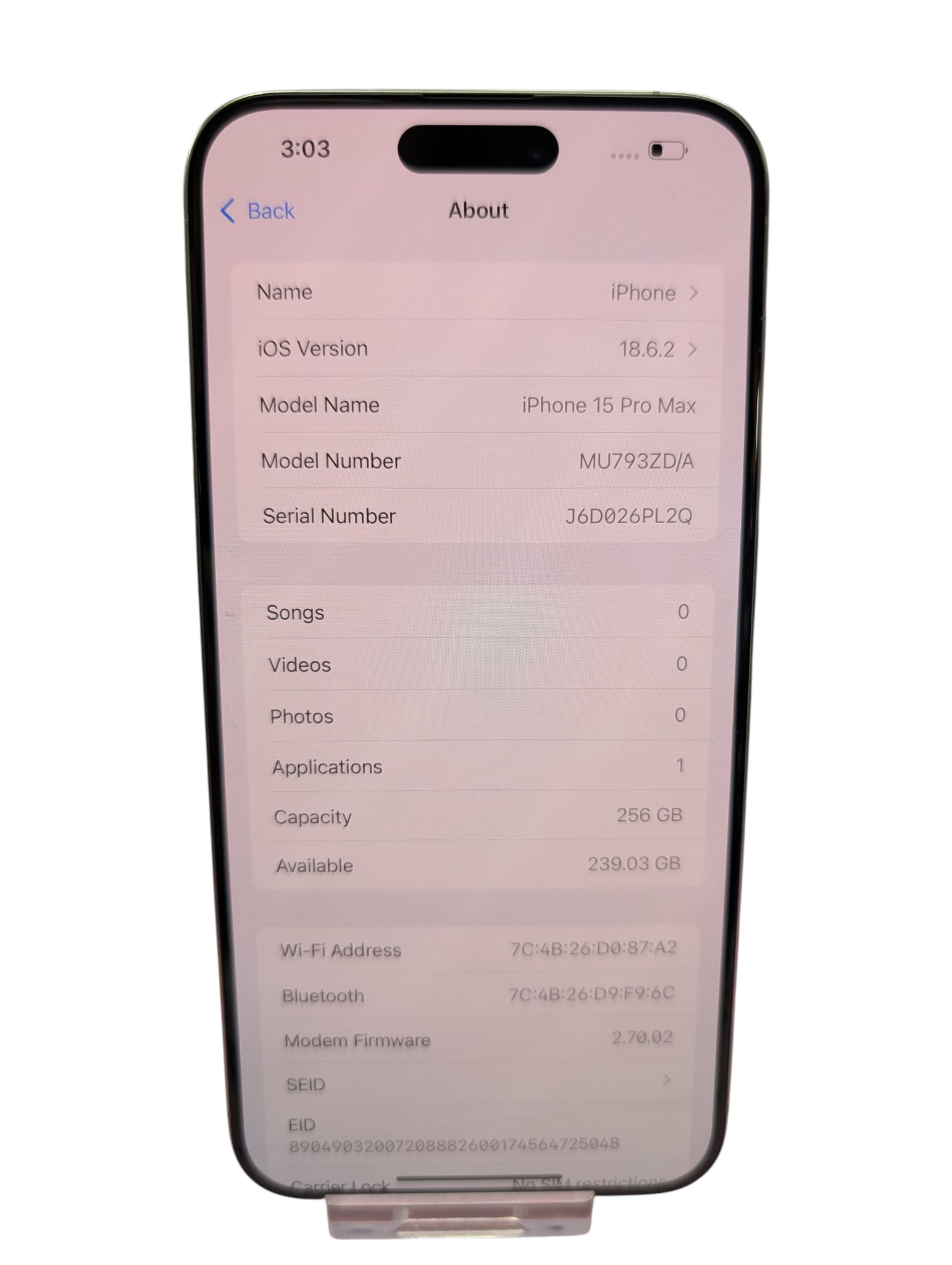 HERE WE HAVE AN APPLE IPHONE 15 PRO MAX MOBILE PHONE THIS HAS A 256GB MEMORY AND 86% BATTERY HEALTH. THIS COMES UNBOXED IN GOOD CONDITION. ** FOR ANY QUERIES PLEASE CALL OUR PRESTON STORE DIRECT MON-SAT 01772 204889