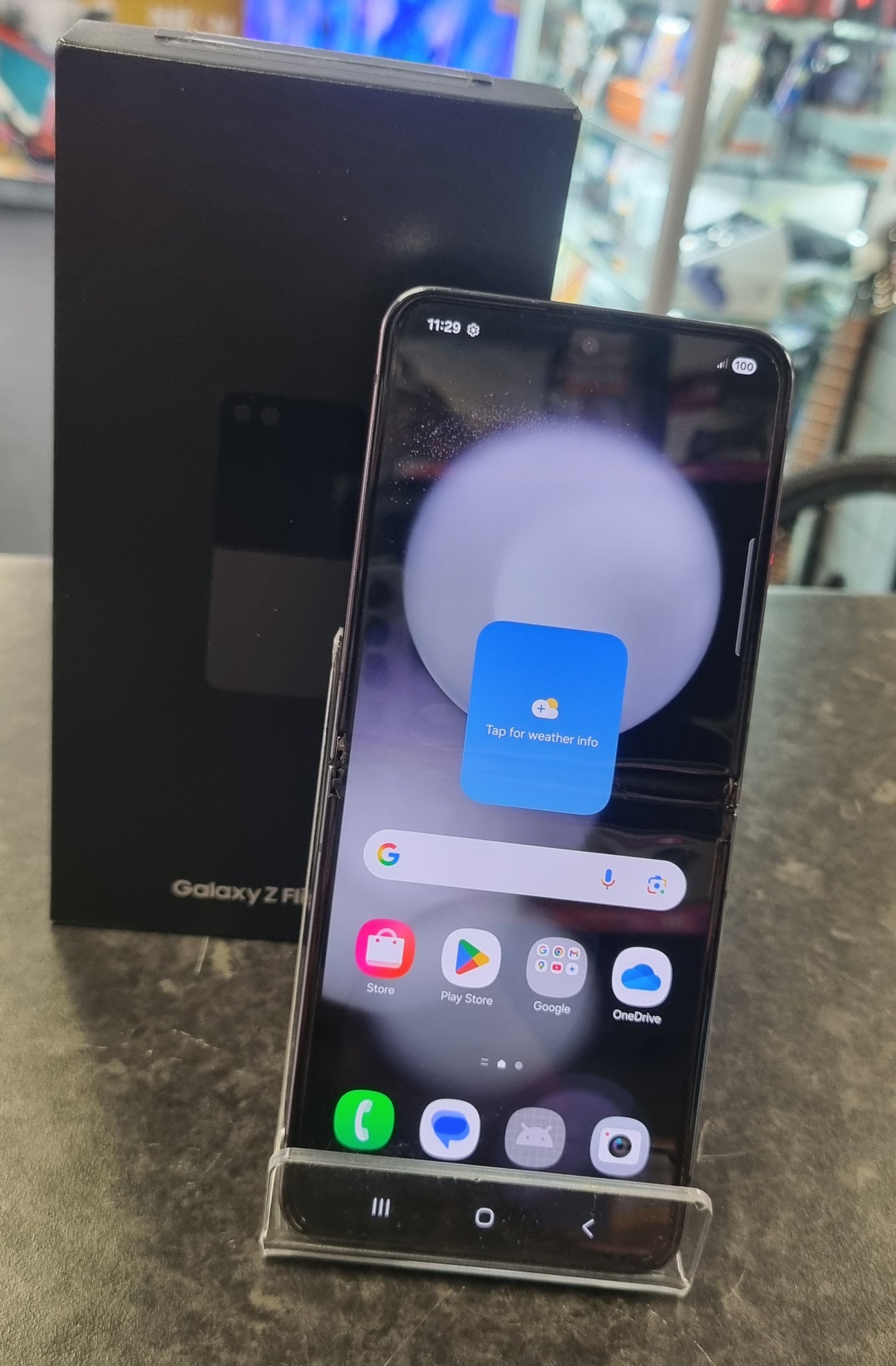 Here we have a Samsung galaxy Z Flip 5. In black this has 256gb storage. This is unlocked to all networks. Comes with box and charging cable. Phone has cosmetic wear from general use, the phone is in full working order. ******************** For more information regarding this item call our Chorley store on 01257 752333 open Mon-Sat between 9:30am-5pm