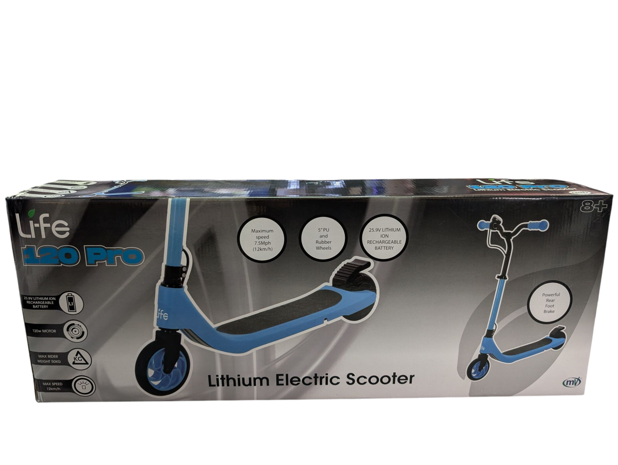 HERE WE HAVE A BRAND NEW BOXED LI-FE 120 PRO ELECTRIC SCOOTER IN BLUE. MAX SPEED: 12KM/HR MAX WEIGHT: 50KG 25.9V RECHARGEABLE LITHIUM ION BATTERY. ***** FOR ANY QUERIES PLEASE CONTACT OUR PRESTON STORE DIRECTLY MON-SAT AT 01772 204889.