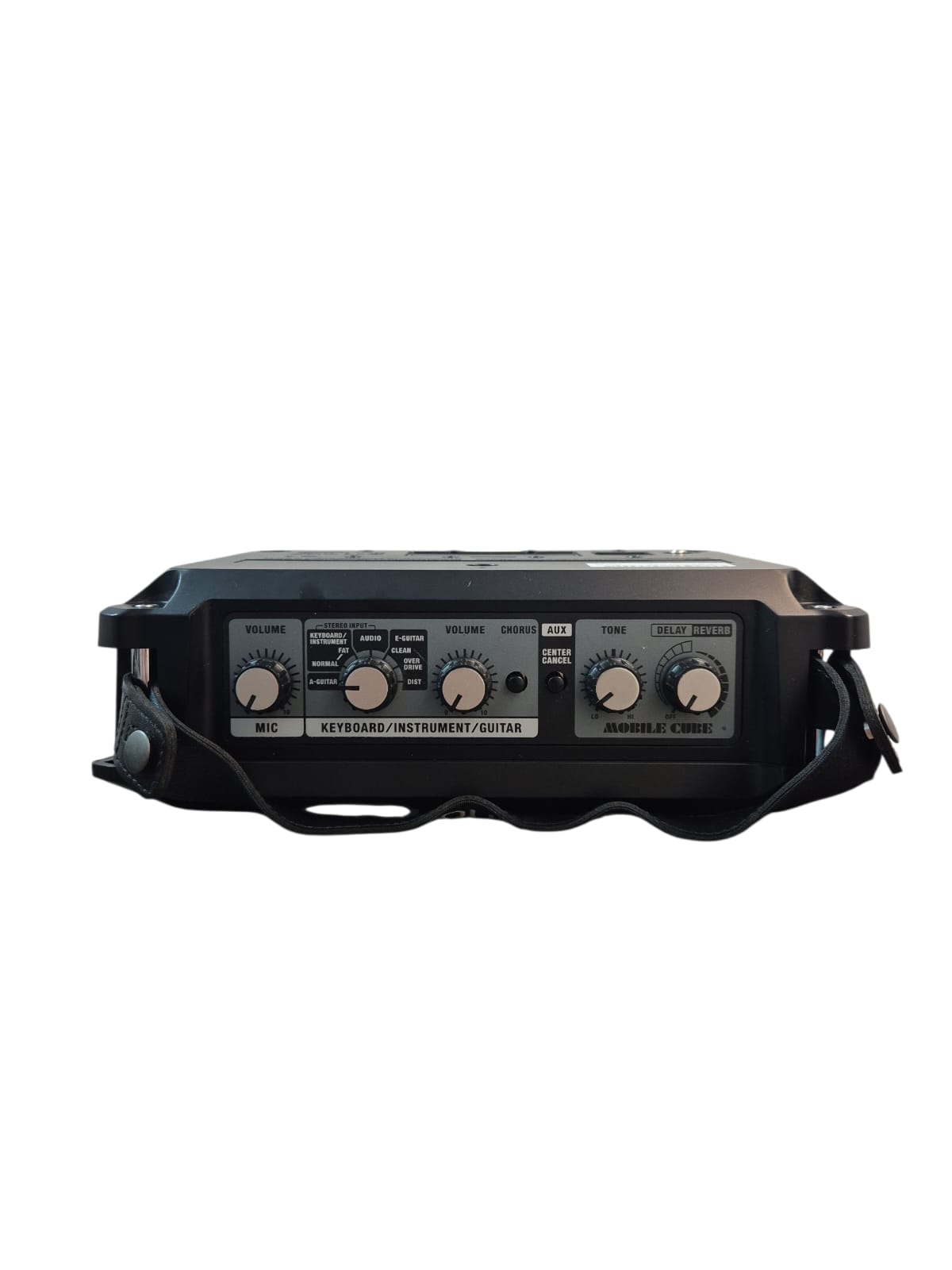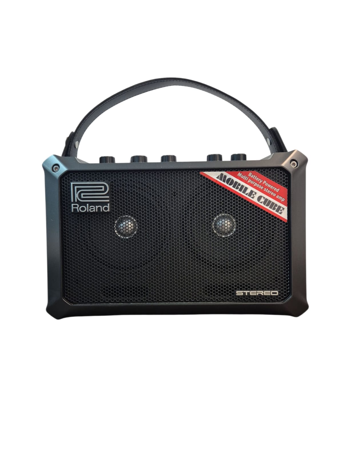 Roland Mobile CUBE The Roland Mobile Cube lets you plug into instant audio entertainment with the new MOBILE CUBE amplifier. Small and mighty, this little stereo amp can handle all types of electronic instruments and audio devices, and can be used anywhere, anytime. Connect microphones, electric and acoustic guitars, keyboards, drum machines, MP3 players, you name it. No larger than a briefcase, MOBILE CUBE is a traveler’s dream. Battery-powered, it can be operated anywhere — just plug in, turn on, and jam. Two high-performance speakers provide stereo sound that defies MOBILE CUBE’s physical size. Equipped with Roland’s legendary FX engine, MOBILE CUBE offers high-quality stereo reverb and chorus effects. Sweeten your vocals, add fire to your guitar tone, or immerse your mixes in a rich stereo sound field. Center Cancel is also provided for minimizing vocals in pre-recorded music — great for karaoke and play-along performance. Thanks to its variety of inputs, MOBILE CUBE accommodates microphones, keyboards, acoustic guitars, electric guitars, MP3 players and more; no other instrument amplifier of this size has a stereo input port. Use it as a practice amp at home, while traveling, indoors or out. It’s great for parties, karaoke and vocal lessons. Connect it to a mic stand for use as a monitor speaker or micro PA.
