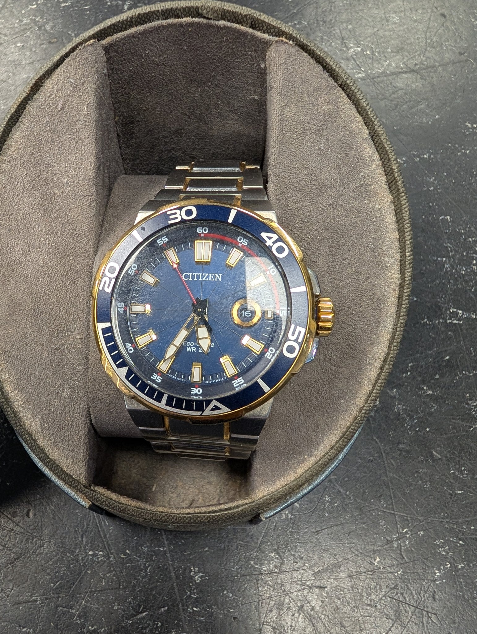 Add a touch of sophistication to your watch collection with this dress chronograph watch from Citizen. This handsome watch, in stainless steel with a blue dial and striking blue bezel, features 1-second chronograph measuring up to 60 minutes, 12/24-hour time and date with scratch resistant glass. It is also water resistant to up to 100 metres. A simple, yet revolutionary concept: a watch that never needs a battery. Citizen Eco-Drive technology harnesses the power of light from any natural or artificial light source and converts it into energy which is stored in a permanently rechargeable lithium-ion cell. It recharges continuously in any kind of light to run forever.