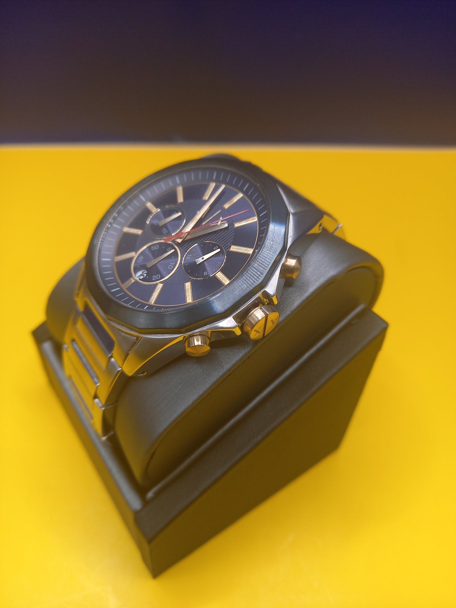 The Armani Exchange AX2614 is a very attractive mens watch. Made of stainless steel case and strap that gives a great fit. The Chronograph function allows you to time certain things it keeps track of the hour minute and seconds. The dark blue dial is complemented by the gold accents of the indicator and hands. Armani Exchange was launched in 1991. It was released as a more accessible Armani brand with in the Giorgio Armani group. Also well known for there occasionally provocative and distinct ad campaigns. They are inspired by street-chic and dance music always the lead in fashion and trends. In the early 2000's the Armani Exchange brand ventured in to the watch making industry. They have been creating innovative watch designs to stand out from the rest in the watch industry.