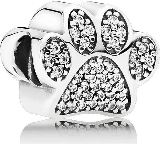 PANDORA Pre-Autumn 2015 collection presents the Paw Prints charm that is made from sterling silver with 48 micro pavT-set cubic zirconia and 34 pavT-set cubic zirconia. This charm has been carefully crafted to resemble the cute paws of your beloved pup. With its sparkly details, it will add a lifelike twist to your bracelet styling.