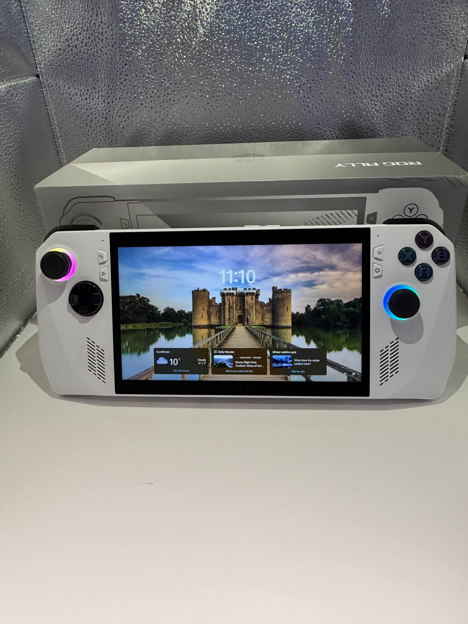 The ASUS ROG Ally redefines portable PC gaming, placing a Windows gaming powerhouse in your grasp without compromising on specifications. Featuring an impressive AMD Ryzen Z1 Extreme CPU with Radeon graphics, it delivers ample power to run your favorite games flawlessly on its 7” Full HD touchscreen, boasting a refresh rate of up to 120 Hz for an exceptionally smooth gaming experience. Enhanced further by Dolby Atmos speakers, the visuals are complemented by immersive sound. Enjoy up to 8 hours of gaming on-the-go thanks to its extended battery life. Key Features: Responsive Xbox-style controls ensure accuracy, enhancing gameplay. Weighing only 600 g and designed with ergonomic grips, it facilitates comfortable gaming for extended periods. The Armoury Crate UI simplifies customization of controls, performance profiles, and more. Parental controls offer easy management of screen time and spending for younger users. Utilize the USB Type-C port for charging or connecting to a monitor or TV. Expand your game library using the microSD card reader located on the top. Enhance performance by connecting the ROG XG Mobile external GPU (sold separately). Safeguard your data with the top-mounted fingerprint sensor, compatible with Windows Hello for security. Customize RGB lighting to match your personal style and preferences, adding a gaming aesthetic to your machine.