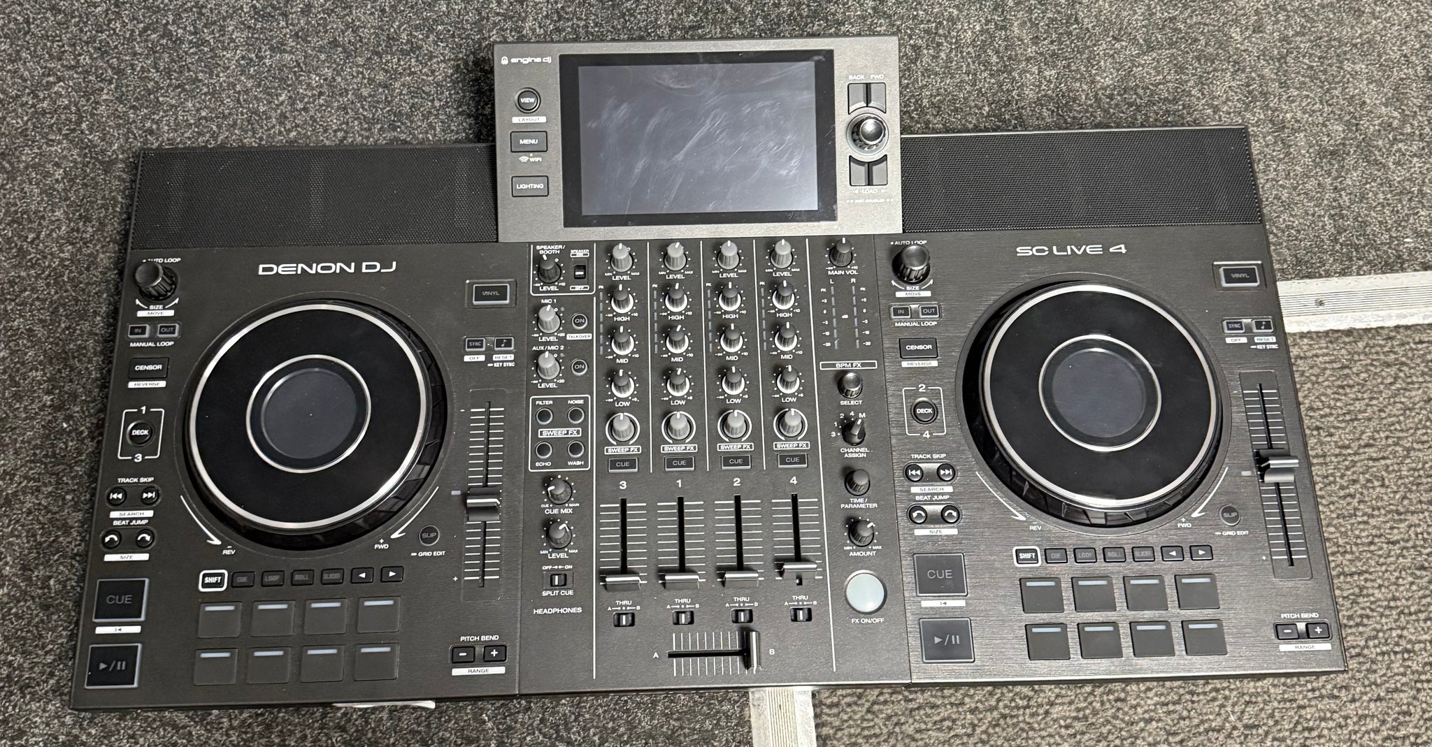 In Good condition with scratches on the screen + clear carry case The Denon DJ SC Live 4 Standalone DJ Controller is an all-in-one system for beginner and professional DJs. Featuring a 7-inch touchscreen, 4 mixer channels, Wi-Fi connectivity and built-in speakers, the SC Live 4 is equipped for high performance. Set the vibe on the dancefloor with ease, you can connect your controller to Amazon Music Unlimited and other streaming platforms. Powered by Engine DJ standalone OS, the SC Live 4 offers a streamlined and hassle-free music search and library upload. The Engine DJ system allows users to import libraries from other DJ software with ease. The Amazon Music Unlimited integration allows you access to over 90 million songs. Equipped with all the features you would expect on flagship Denon DJ media players and mixers, the SC Live 4 has all the components of a modular DJ setup condensed into one. The SC Live 4 has two jog wheels with deck switch, speed, looping and hot cue controls and a mixer section with 13 BPM FX and four sweep FX. Connect to any standard sound system with the RCA, XLR or jack outputs, or use the SC Live 4's integrated speaker system.