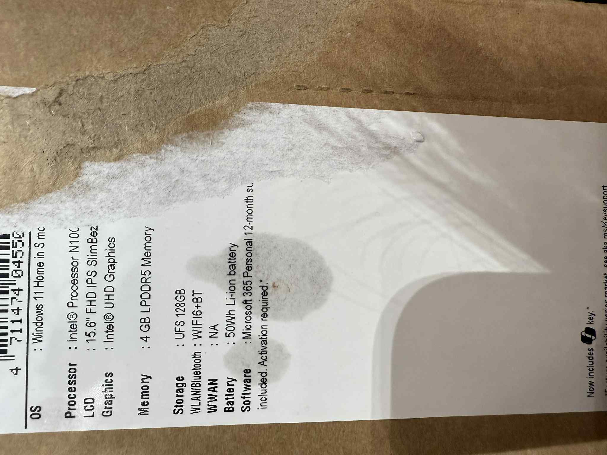 comes boxed, with charger and a case . model number: ag15- 31p-c5fa 4gb ram 128gb memory window 11 home