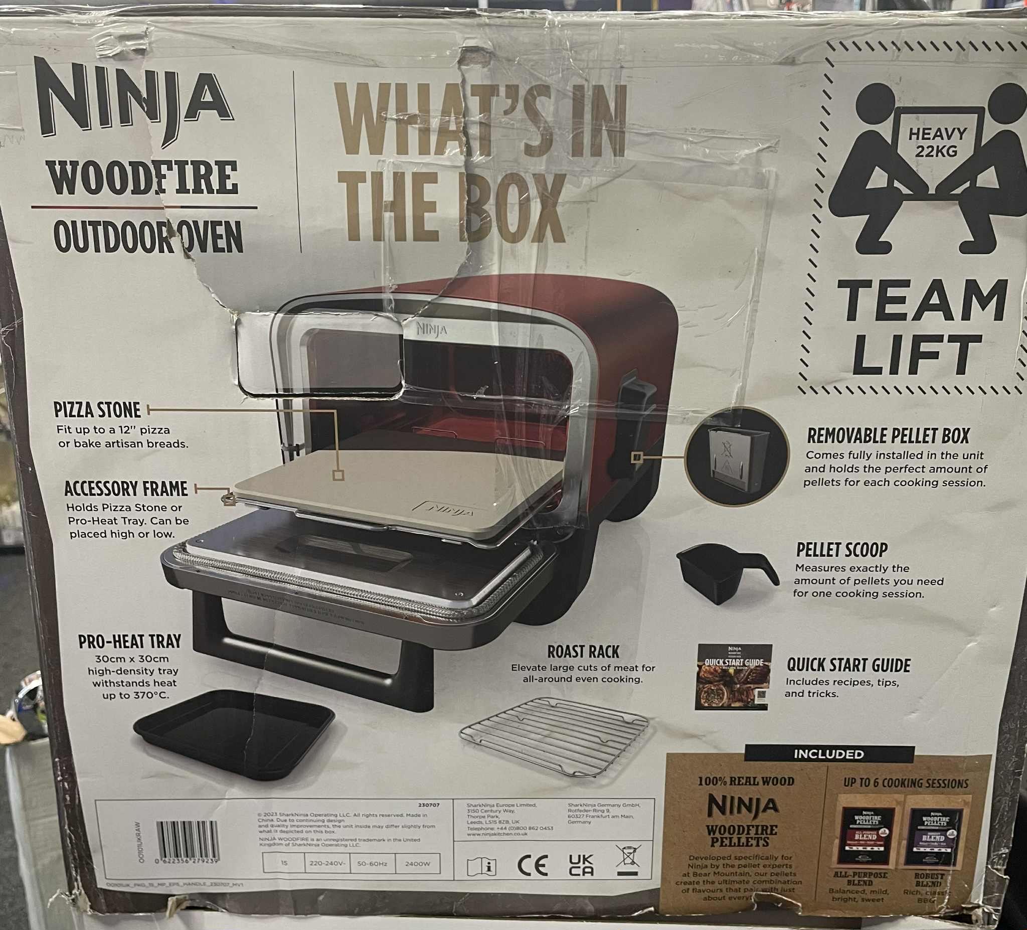 Ninja woodfire outdoor oven 8-IN-1 OUTDOOR ROASTER OVEN, PIZZA OVEN & BBQ SMOKER: Pizza, Max Roast, Gourmet Roast, Top Heat, Bake, Smoker, Dehydrate & Keep Warm functions. Take the kitchen outdoors & unlock a world of flavours. No-turn pizzas in under 3 minutes*. Artisan, Thin, New York, Deep Pan, Calzone 370C HIGH-HEAT: Brick-oven inspired charring, blistering and sizzling. High-power electric heat for complete temp control. Fit up to 5kg beef joint, 2 racks of ribs, a traybake meal or 12" pizza Comes in box Good condition Box a little damaged