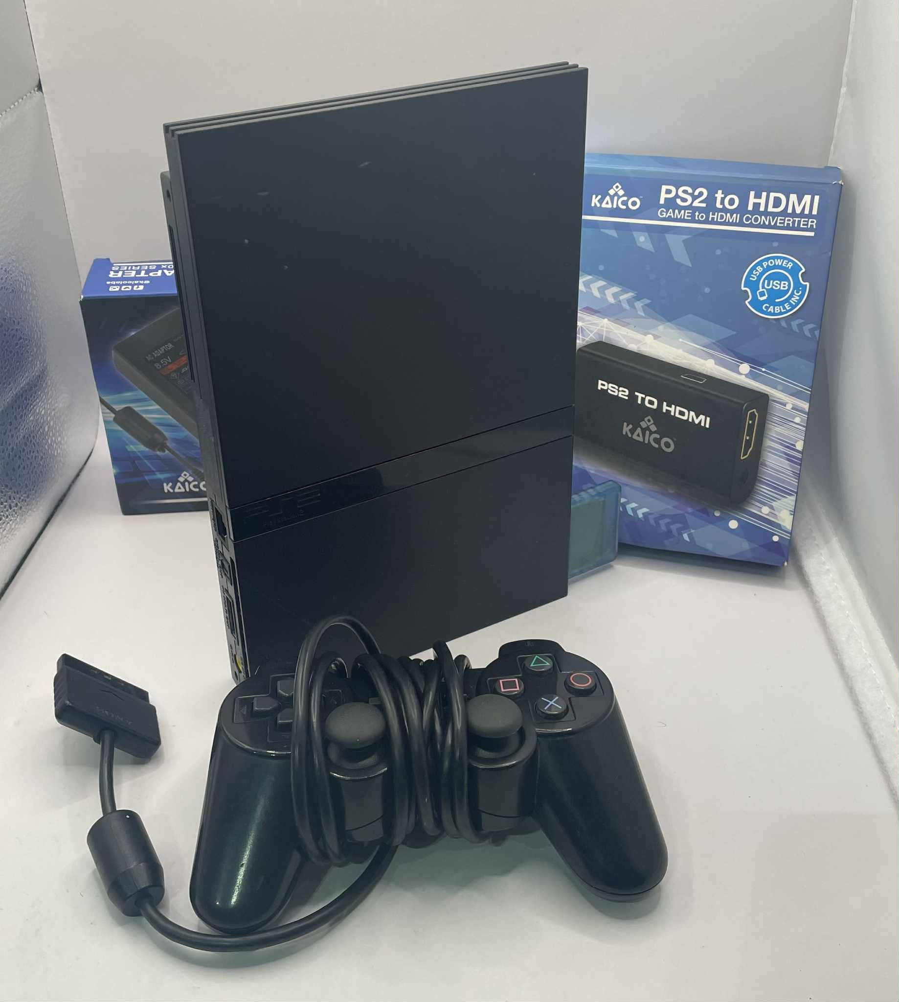 Playstation 2 - Slim Comes power lead PS2 to HDMI converter Comes with one controller Comes with 8mb memory card Some small white marks on the front of the console as shown in photo Tested in store all working