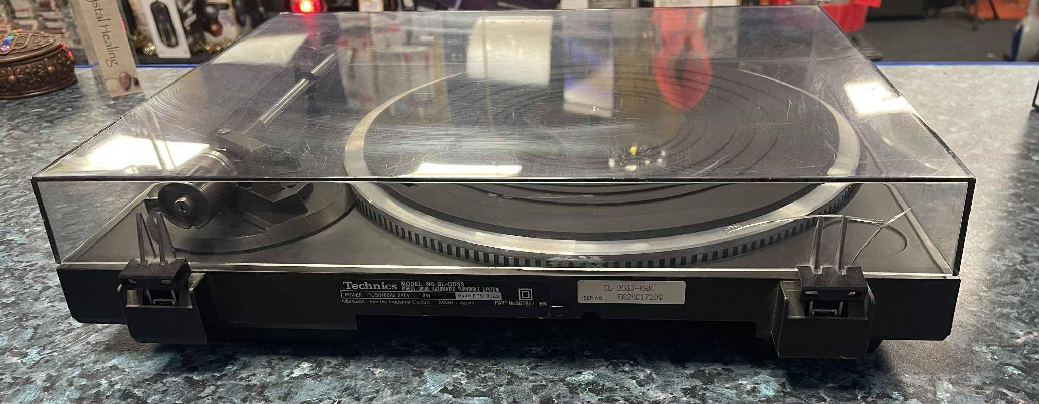 Technics Quartz Direct Drive Automatic Turntable System Model: SL-QD33 Power: ~ 50/60Hz 240V Cosmetic scratches on the cover and has a crack on back of the cover as it is shown in photos. Doesn't include box and power lead. Good working condition.