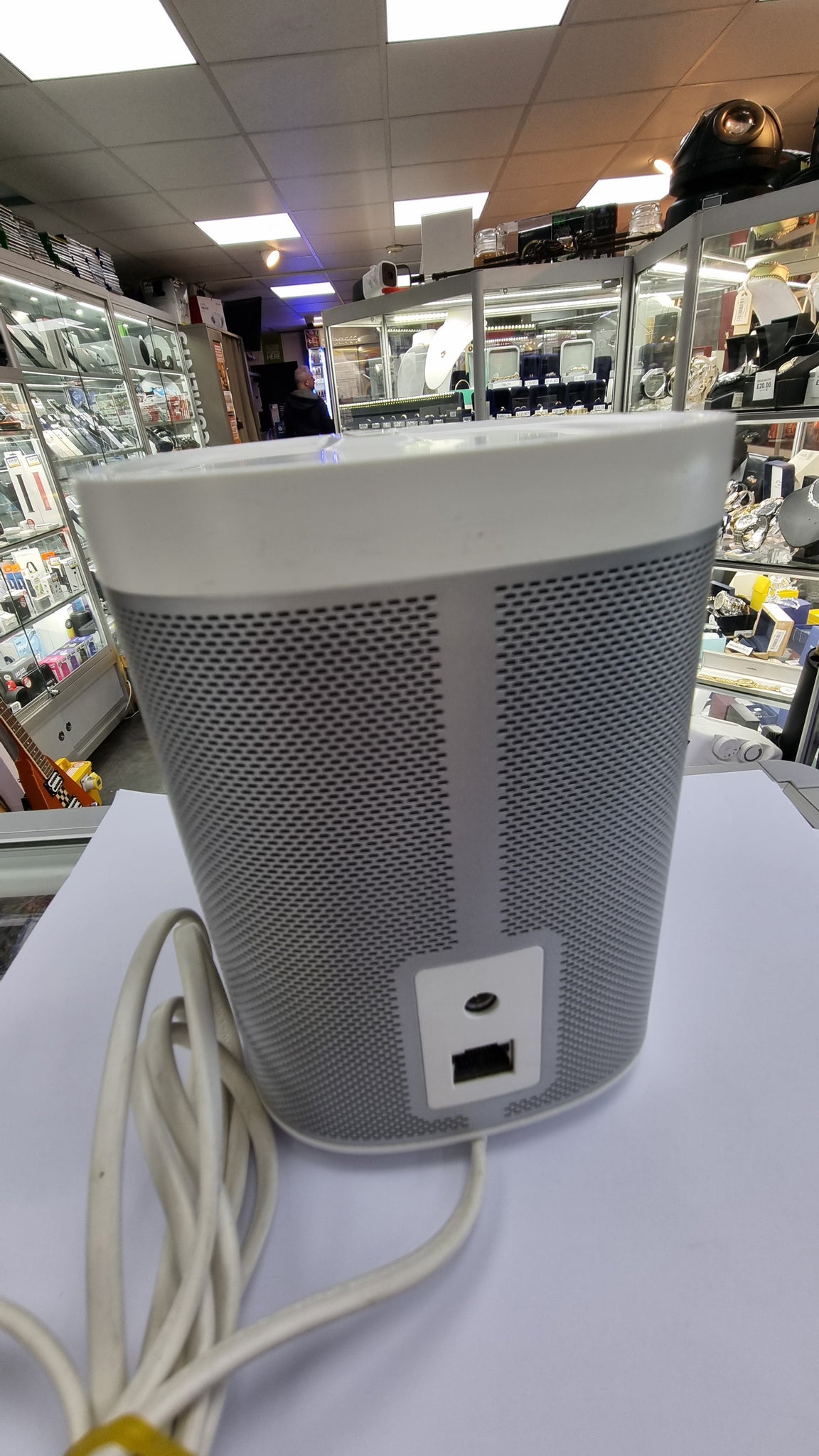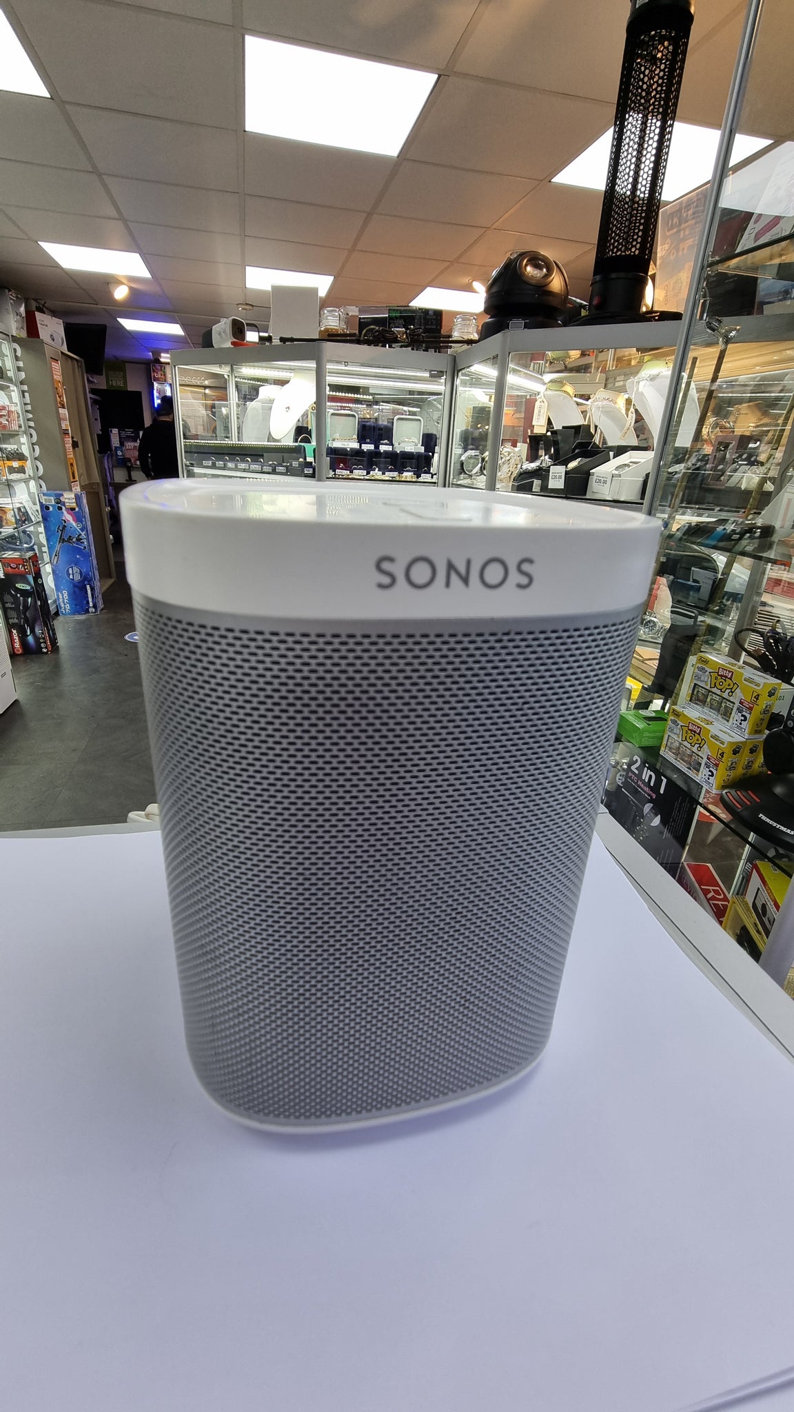 This is in good condition, fully tested in store. Comes unboxed. Wired ******************* ************************************************************ The powerful smart speaker with voice control built-in. Get rich, room-filling sound with Sonos One, and control it with your voice, the Sonos app, Apple AirPlay 2, and more. Brilliant sound for every room The compact design fits just about any space. Put it on your kitchen countertop or tuck it away on your office bookshelf. Voice control The Google Assistant and Amazon Alexa are built right in so you can play music, check the news, set alarms, get your questions answered, and more, completely hands-free. Stereo sound with two Pair two Sonos Ones together in the same room for stereo separation and more detailed sound. Use a pair as rear home cinema surrounds with Playbar, Playbase, or Beam.