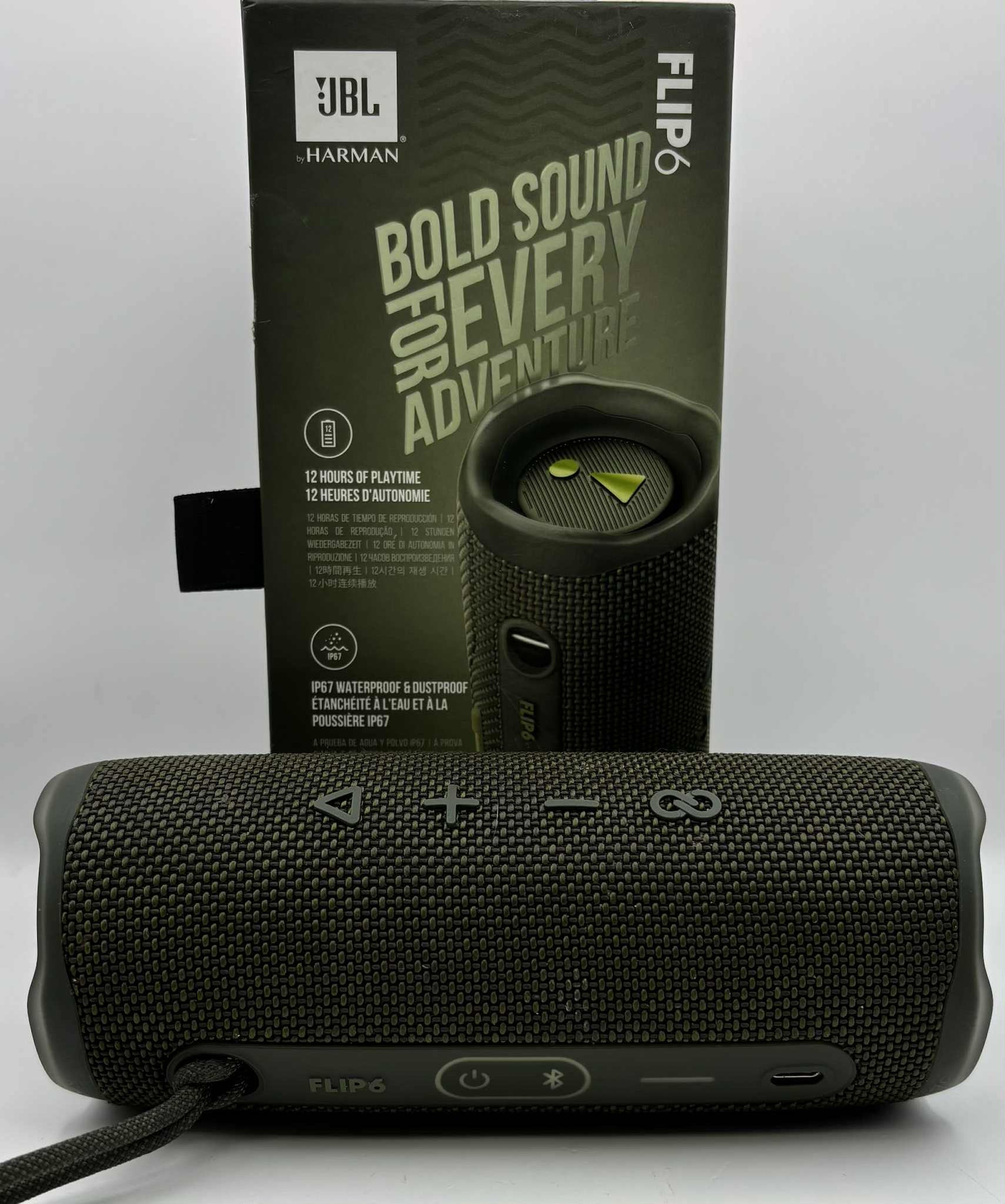 Louder, more powerful Sound: The beat goes on with a 2-way speaker system engineered to deliver powerful sound with low frequencies while a separate tweeter produces crisp, clear high-frequencies 12 Hours of Playtime: Don't sweat the small stuff like charging your battery because the JBL Flip 6 gives you up to 12 hours of playtime on a single charge, so you can keep the party going longer IP67 Waterproof Design: Whether you're hanging out at the park, relaxing on the beach or lounging by the pool, the IP67 waterproof and dustproof design means you can bring your speaker anywhere Bold design meets bold audio: A versatile design means you can stand the Flip 6 vertically or horizontally and loud JBL Original Pro Sound offers a truly immersive listening experience wherever you go Items Delivered: 1 x JBL Flip 6 Portable Waterproof Bluetooth Speaker, 1 x USB-C charging cable, 1 x quick start guide and safety sheet, in green