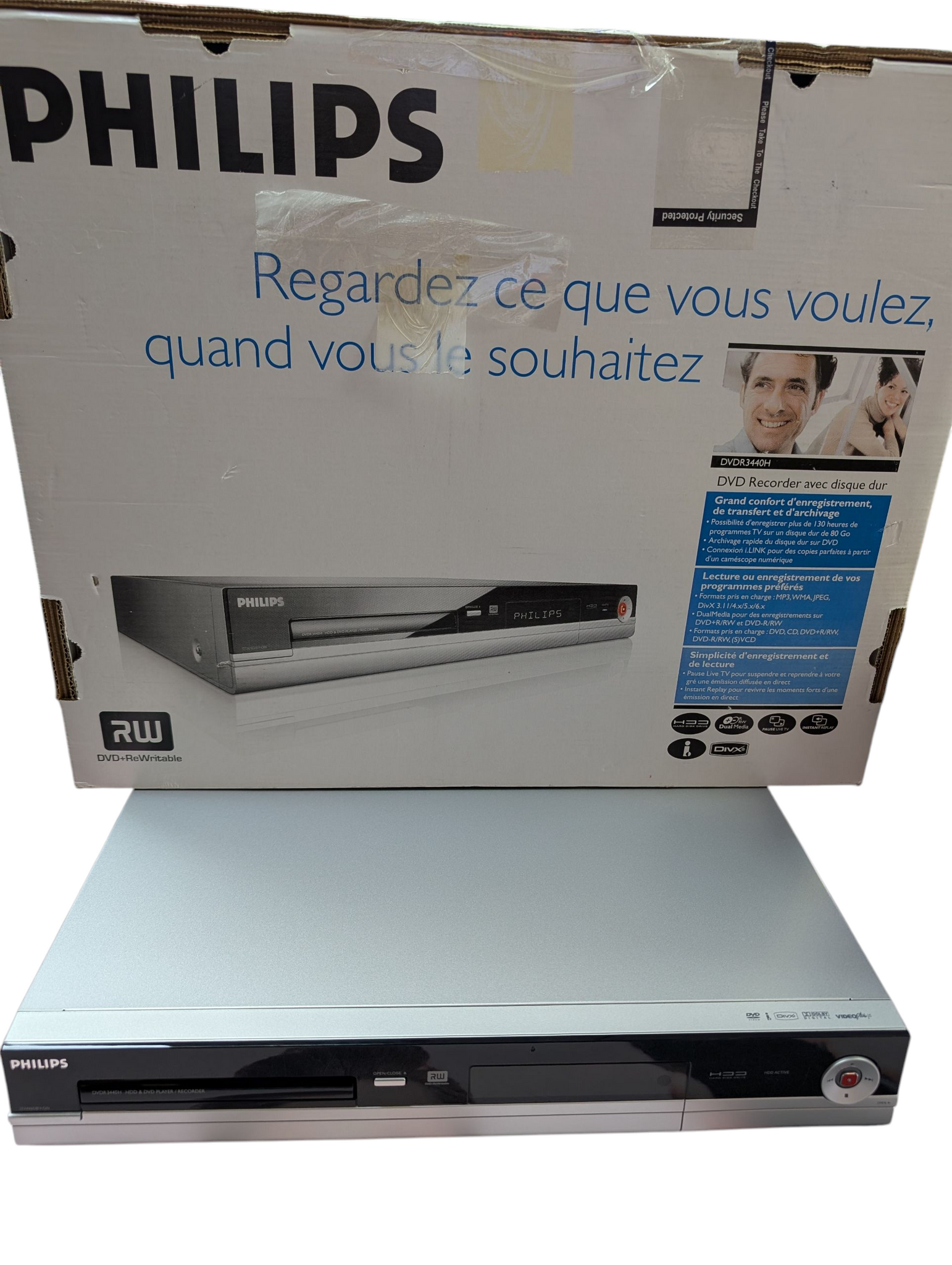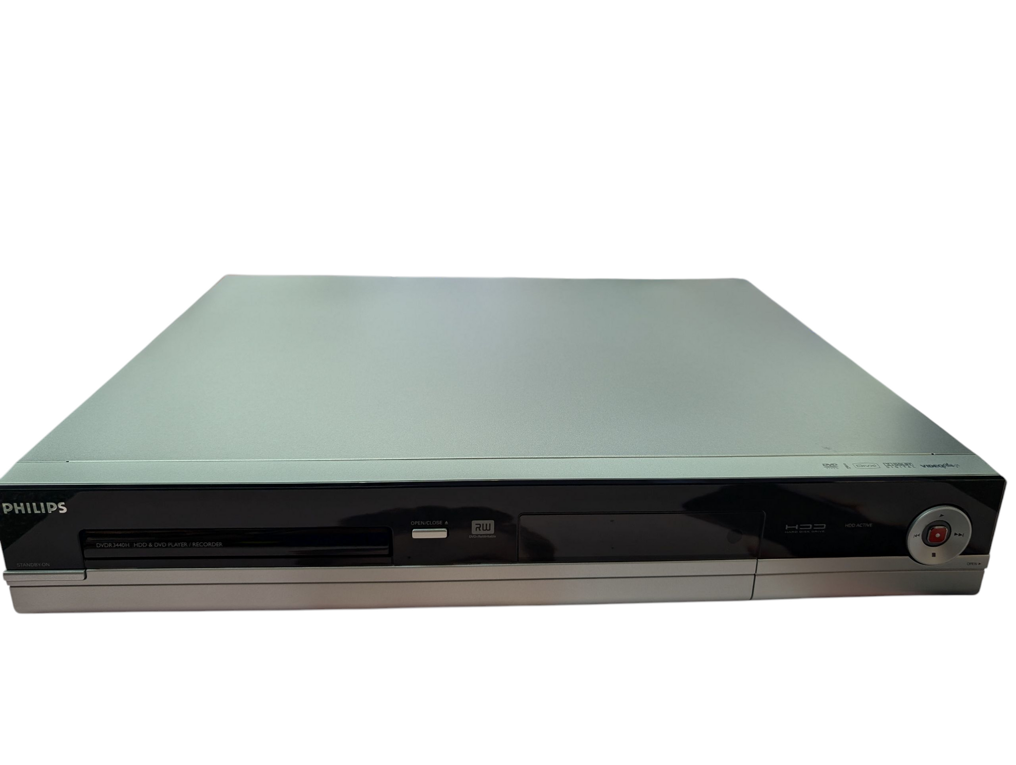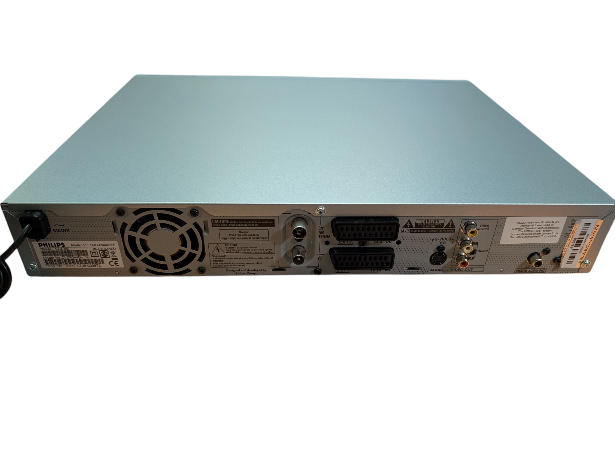PHILIPS DVD RECORDER MODEL DVDR3440H/05. THIS COMES BOXED WITH REMOTE IN VERY GOOD CONDITION. (PLEASE NOTE THIS IS A SCART FIT)………… The Philips DVDR3440H/05 is a combined hard disk and DVD recorder that allows users to record, store, and play back content from live TV, recorded programs, and discs. It features an 80GB hard drive for extensive recording, supports various disc formats (DVD, DVD+/-R/RW, CD, VCD), and can play multimedia files like MP3, JPEG, and DivX. The device includes features such as one-touch recording, simple VIDEO Plus+ scheduling, and dual-media recording capabilities for recording onto either DVD or hard drive **** FOR ANY QUERIES PLEASE CALL OUR PRESTON STORE DIRECT MON-SAT 01772 204889