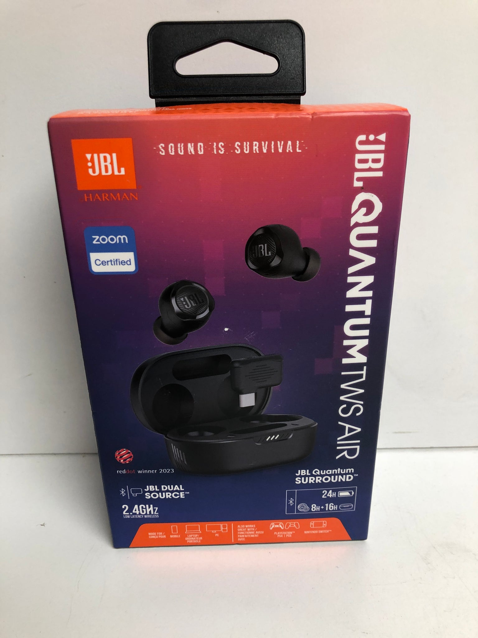 The JBL Quantum TWS Air are true wireless gaming earbuds that offer excellent all-round performance, perfect for use at home and taking with you on the go. They achieve a low latency wireless connection, packed with a 2.4GHz USB-C dongle to completely reduce delay for devices like smartphones, tablets, and handheld consoles like the Nintendo Switch. Just you and your games; no wires, no fuss.They feature Smart Ambient technology, allowing you to filter through the sound of your surroundings without having to take them out, and with JBL Dual Source and Fast Pair, you can connect multiple devices and take calls without having to disconnect from your console for total convenience. With four beamforming microphones, your voice will always come through loud and clear. Enjoy up to eight hours of playtime, with an additional 16 hours from the charging case totalling a full 24 hours of use. These earbuds are ideal for your daily commute, long journeys, or focused gaming sessions without needing to recharge. Plus, the IPX4 water resistance and lightweight design make them the perfect pick for high-intensity sessions in VR. Quantum TWS Air, the essential gamer's companion. compatible with mobile/laptop/playstation 4/5 and Nintendo switch boxed, still sealed new item