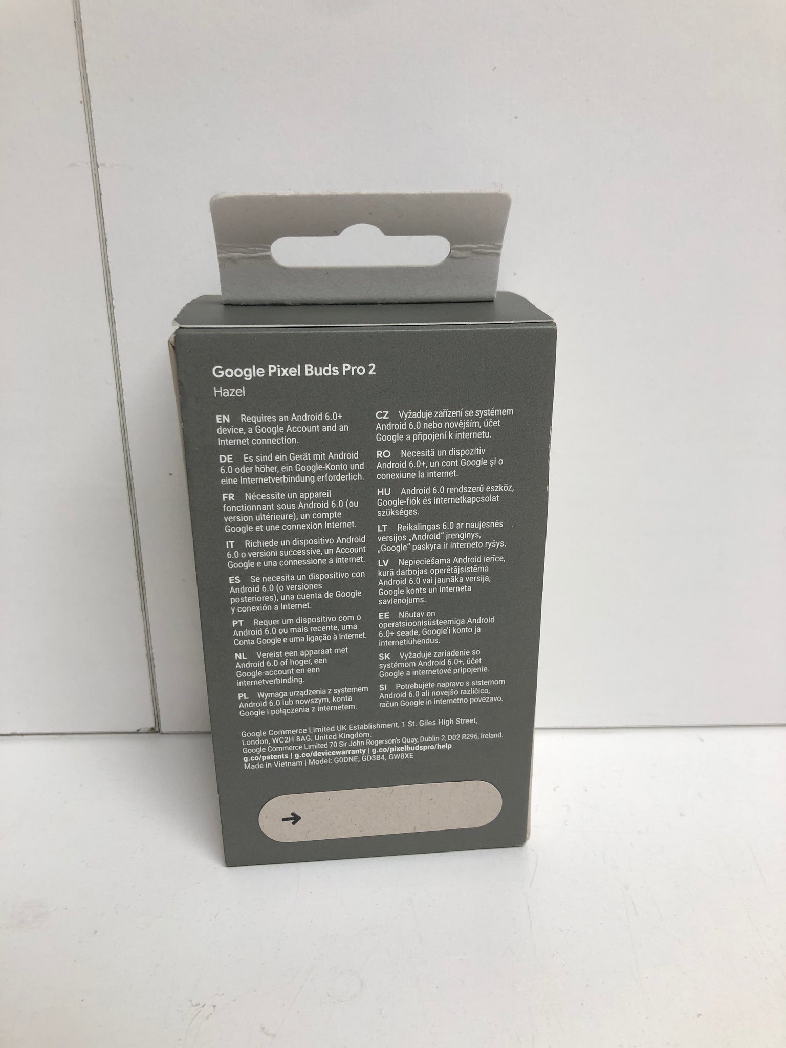 Brand Google Colour Hazel Form factor In Ear Noise control Active Noise Cancellation Model name Pixel Buds Pro 2 Connectivity technology Wireless Wireless communication technology Bluetooth Included components Cable Age range (description) All Specific uses for product Exercise, Music, Calling Designed to be the most comfortable earbuds ever. Pixel Buds 2 are small, light and comfortable. Use the twist-to-adjust stabiliser to lock your earbuds in during workouts or adjust the other way for all-day comfort. Built for AI, the Tensor A1 chip powers twice the Active Noise Cancellation and delivers premium sound. Pixel Buds Pro 2 seamlessly connect with your Pixel phone, watch and tablet for clearer calls. And Find My Device helps you go from lost to found, just like that. Conversation Detection pauses your music when you start talking, so you don't have to take out your earbuds any more. 30 hours of listening with ANC. Wireless charging. Sweat and water resistant.